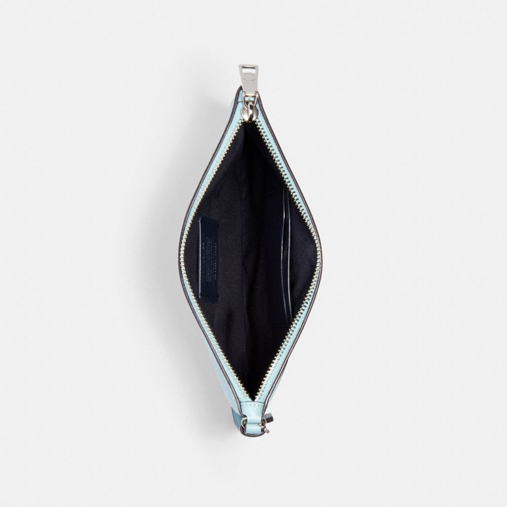 Crossgrain leather| Two credit card slots| Zip-top closure, fabric lining| Outside zip pocket| Detachable wrist strap| 9 1/4" (L) x 6 3/4" (H)