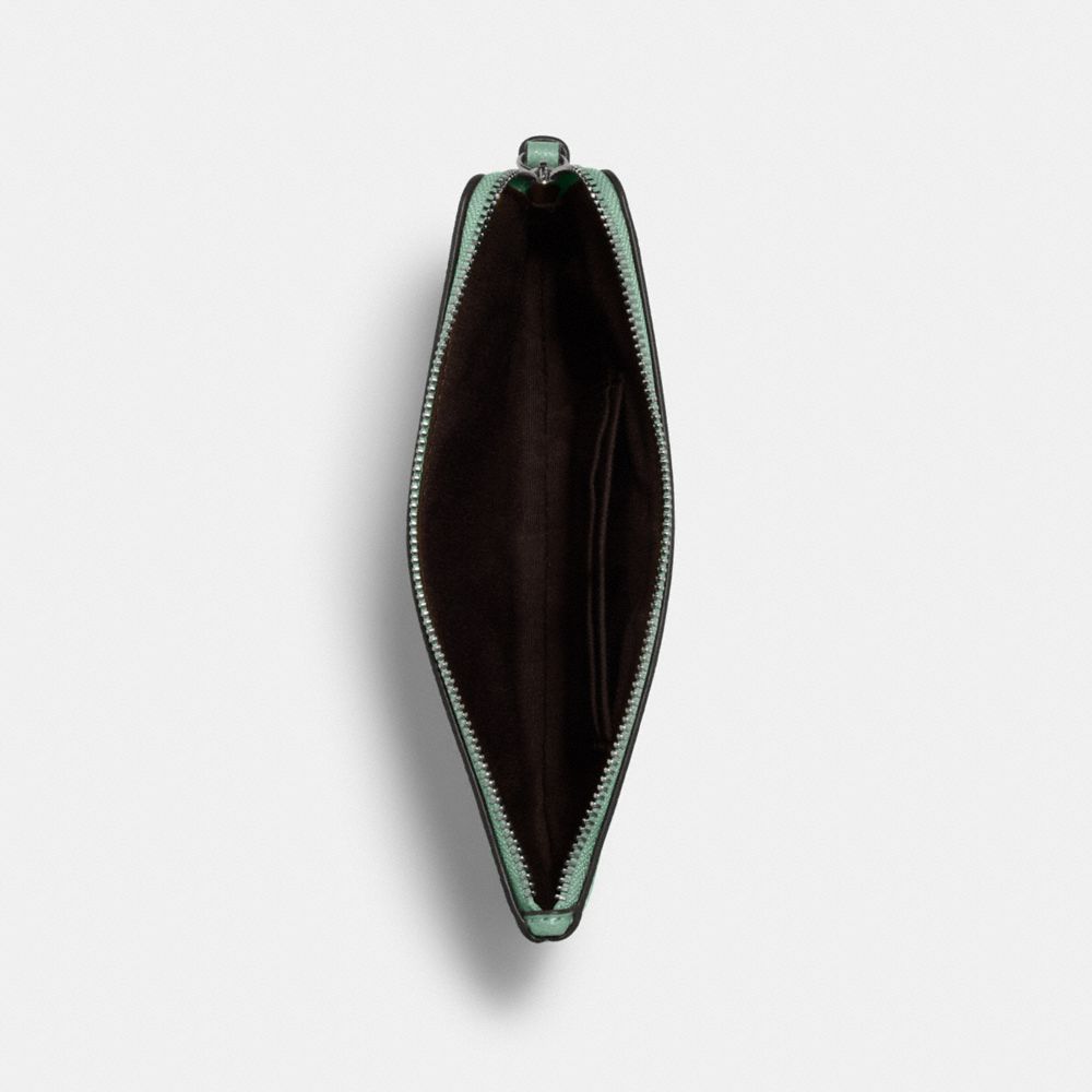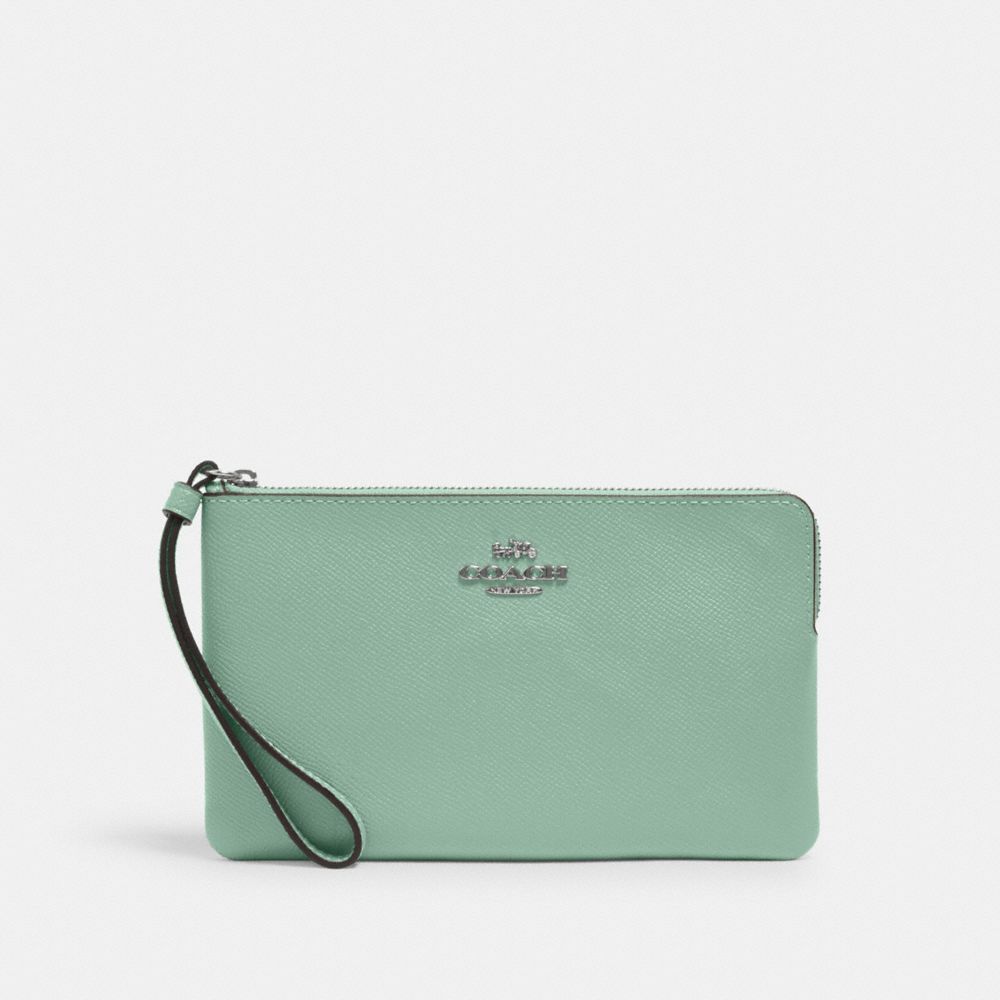 Crossgrain leather| Two credit card slots| Zip closure, fabric lining| Wrist strap attached| 7 3/4" (L) x 4 3/4" (H) x 1/2" (W)