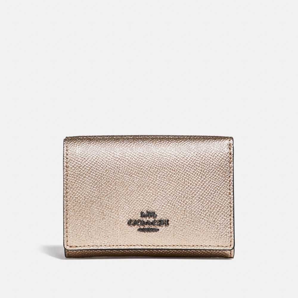Metallic crossgrain leather| Six credit card slots| Full-length bill compartment| Snap closure| Outside snap coin pocket| 4 1/4" (L) x 3" (H)