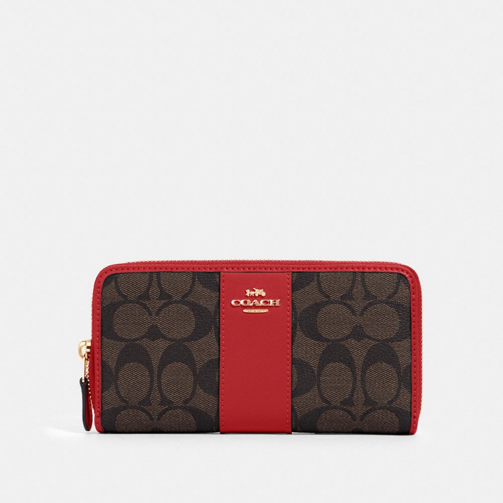 Signature coated canvas with crossgrain leather details| 12 credit card slots| Full-length bill compartments| Zip coin pocket| Zip-around closure| 7 1/2" (L) x 4" (H) x 3/4" (W)| Fits all phone sizes up to an iPhone X and Samsung S7 Edge