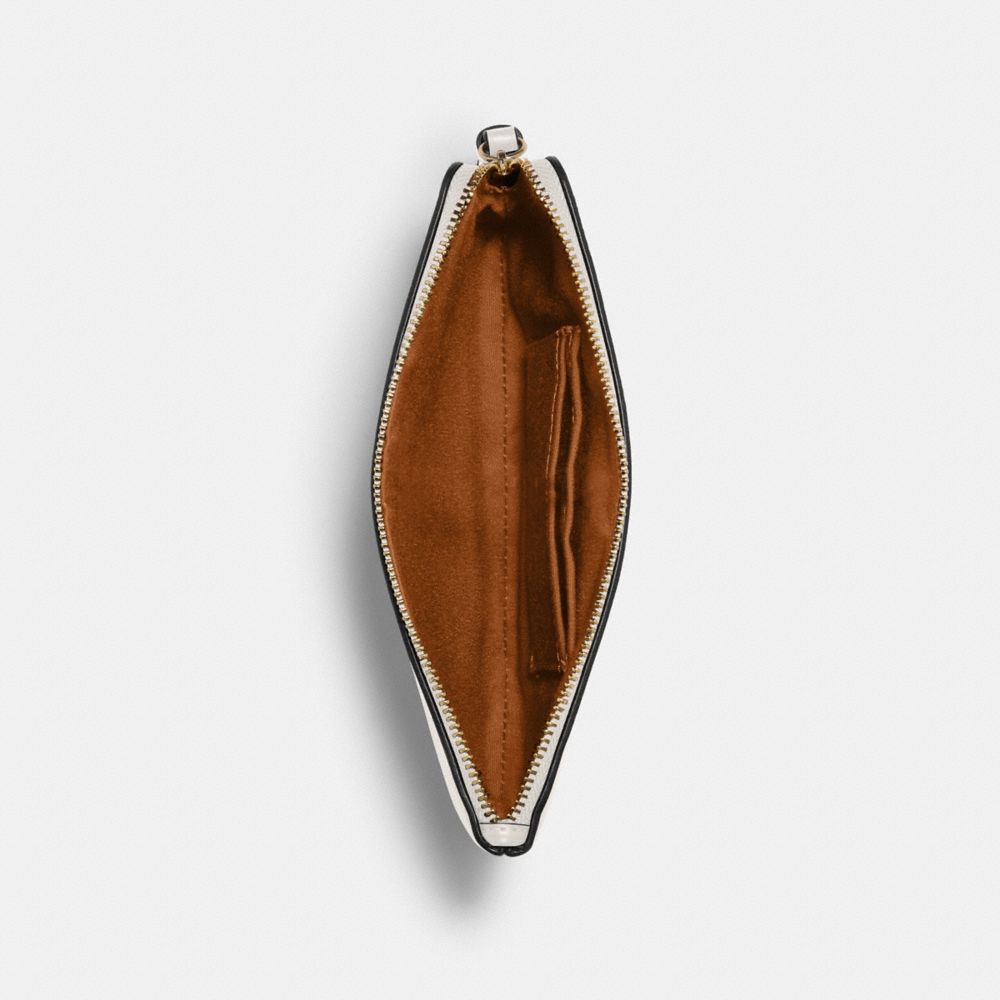 Signature coated canvas and smooth leather| Two credit card slots| Zip closure, fabric lining| Wrist strap attached| 7 3/4" (L) x 4 3/4" (H) x 1/2" (W)