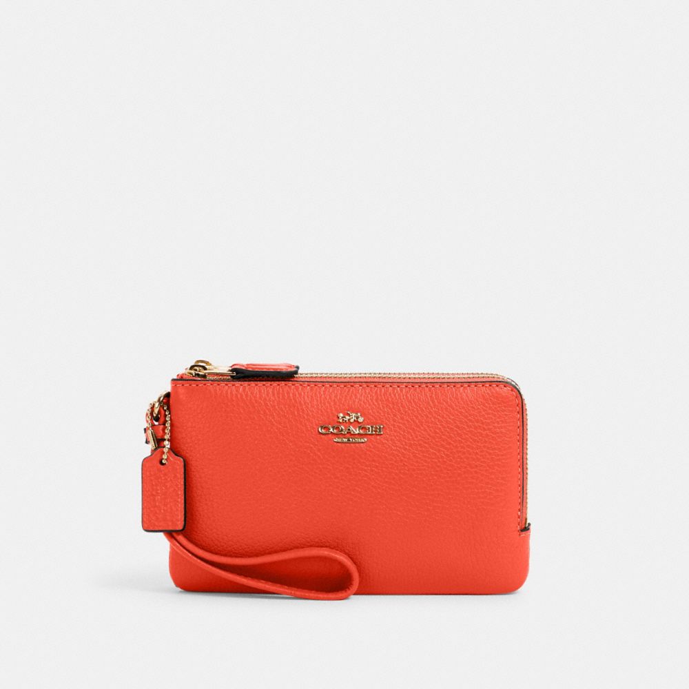 Refined pebble leather| Two credit card slots| Double zip closure, fabric lining| Wrist strap attached| 6 1/2" (L) x 3 3/4" (H) x 1 3/4" (W)| Fits an iPhone or Android