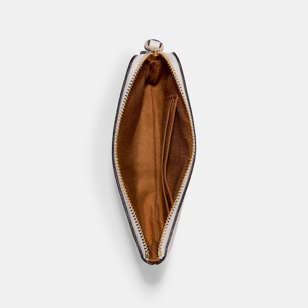 Printed coated canvas and smooth leather| Two credit card slots| Zip-top closure, fabric lining| Wrist strap attached| 6 1/4" (L) x 4" (H) x 1/2" (W)