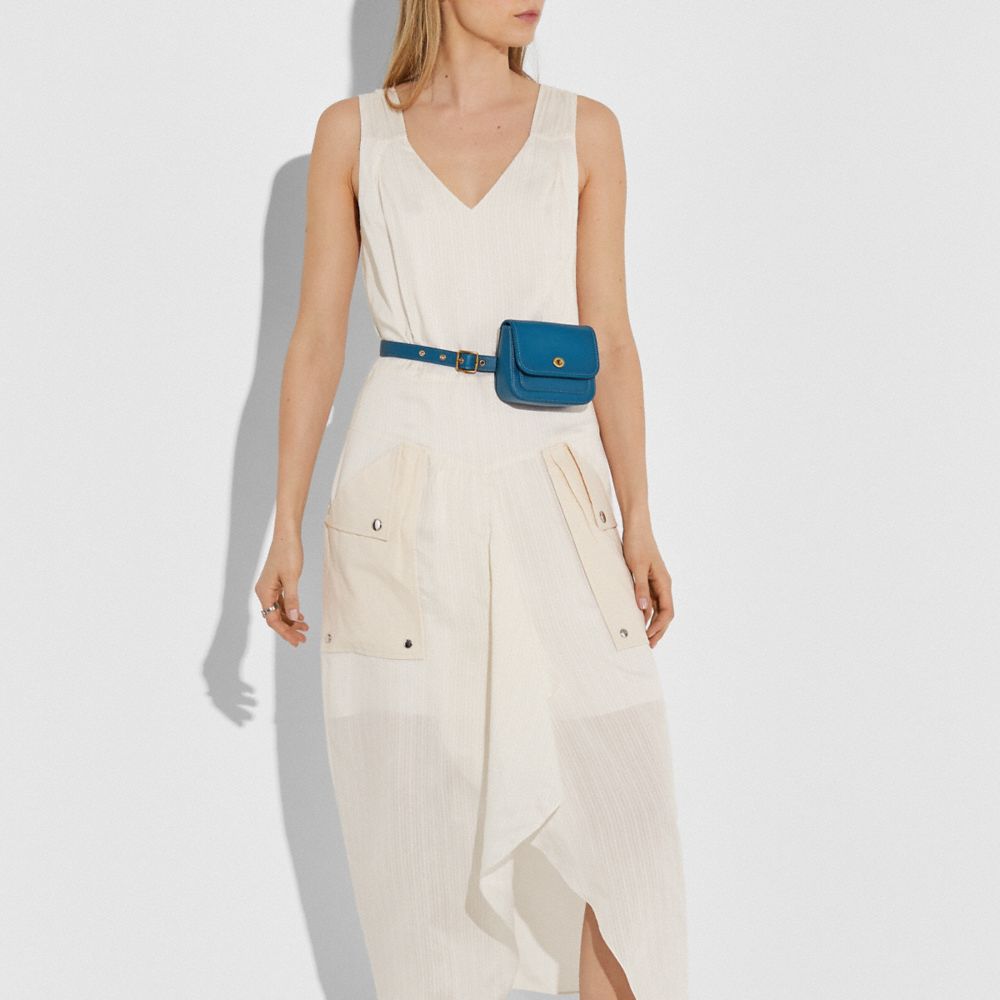Glovetanned leather| One credit card slot| Inside multifunction pocket| Turnlock closure, leather lining| Outside slip pocket| Adjustable strap for wear at waist| Detachable strap with 21 1/2" drop for shoulder or crossbody wear| 5" (L) x 4 1/4" (H) x 1 3/4" (W)