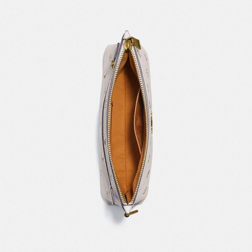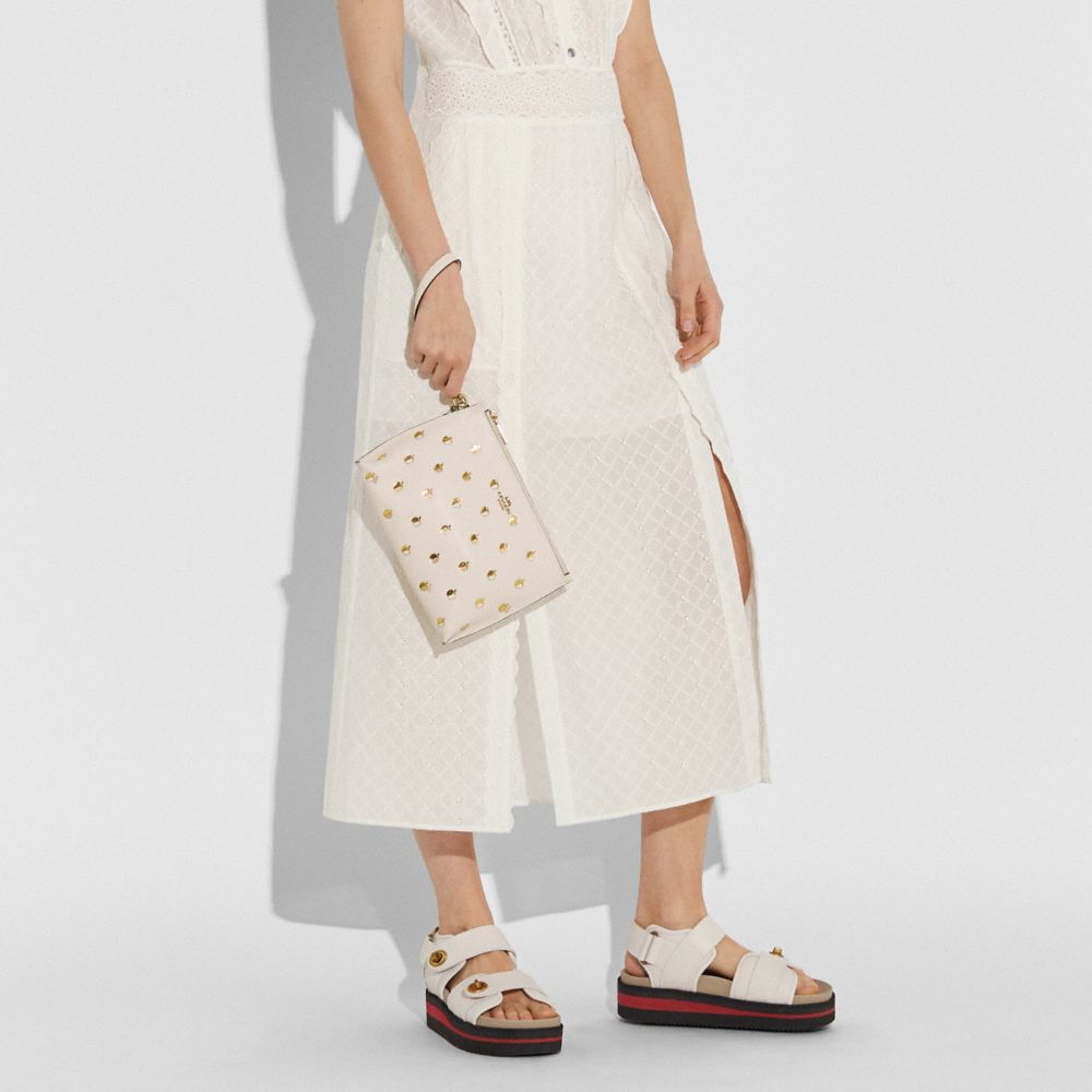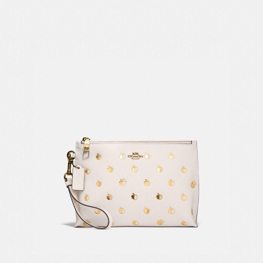 Polished pebble leather| Two credit card slots| Zip-top closure, fabric lining| Outside zip pocket| Detachable wrist strap| 9 1/4" (L) x 6 3/4" (H) x 2" (W)