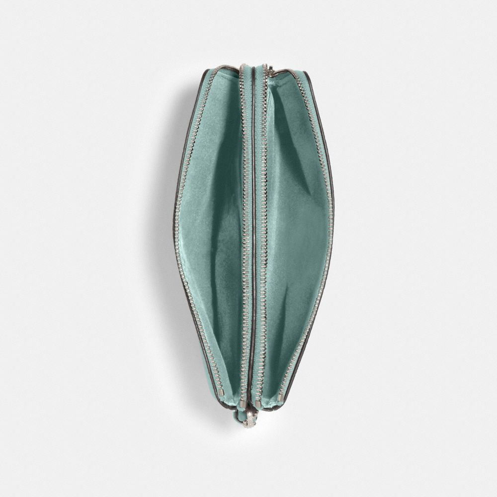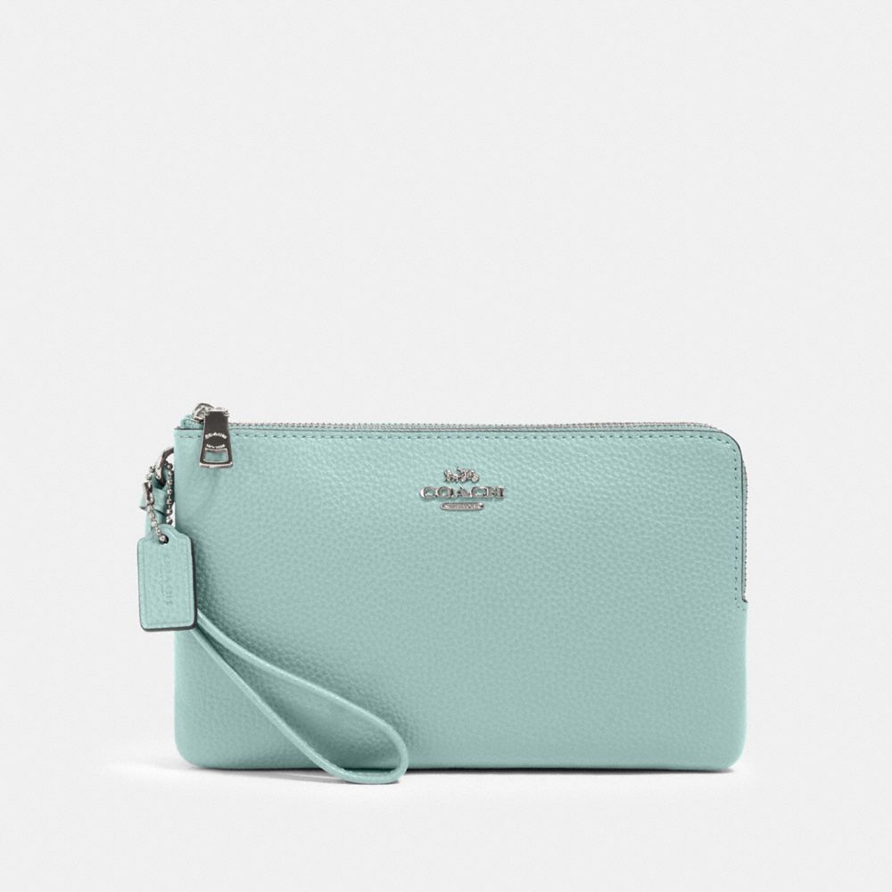 Polished pebble leather| Six credit card slots| Full-length bill compartment| Inside open pockets| Double zip closure, fabric lining| Wrist strap attached| 8 1/2" (L) x 4 1/2" (H) x 1 1/4" (W)| Fits all phone sizes up to an iPhone X and Samsung S7 Edge