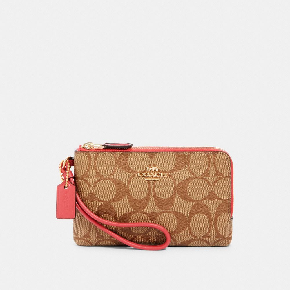 Signature coated canvas| Two credit card slots| Double zip closure, fabric lining| Wrist strap attached| 6 1/2" (L) x 3 3/4" (H) | Fits an iPhone or Android