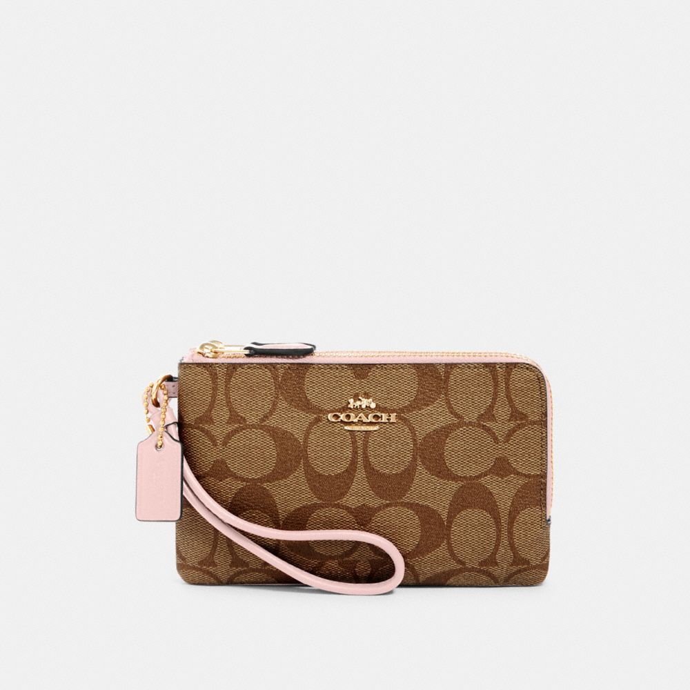 Signature coated canvas| Two credit card slots| Double zip closure, fabric lining| Wrist strap attached| 6 1/2" (L) x 3 3/4" (H) | Fits an iPhone or Android