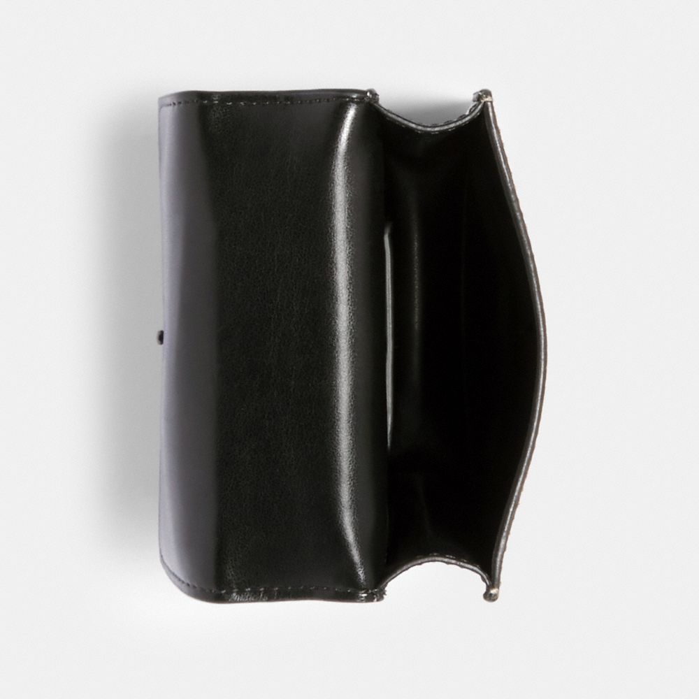 Signature coated canvas and refined calf leather| Snap closure, fabric lining| Outside credit card slot| Adjustable strap with 25" drop for shoulder or crossbody wear| 4 1/4" (L) x 7" (H) x 1 1/4" (W)
