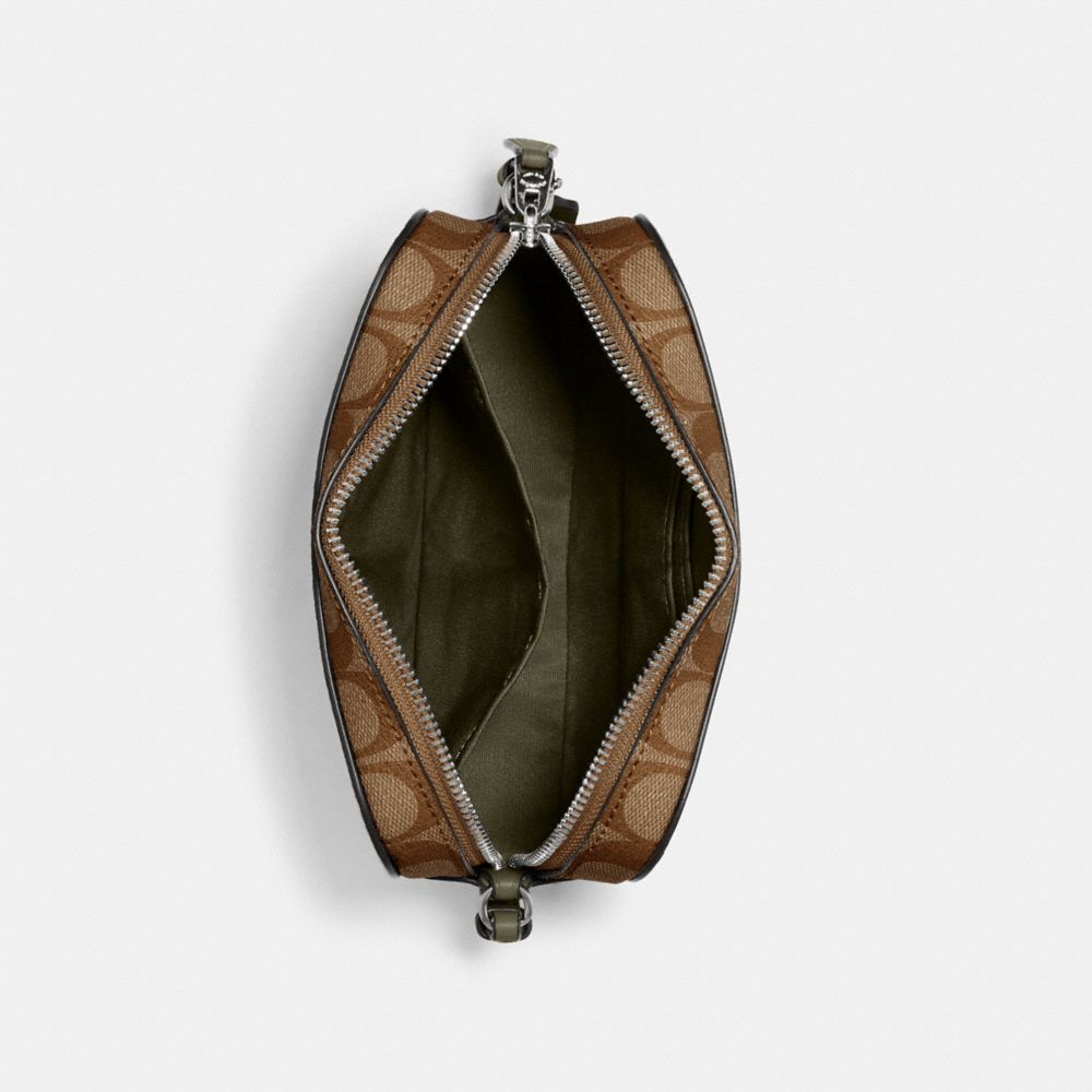 Signature coated canvas and smooth leather| Two credit card slots| Inside multifunction pocket| Zip closure, fabric lining| Outside open pocket| Adjustable strap with 23" drop for shoulder or crossbody wear| 7 1/4" (L) x 5 1/4" (H) x 2" (H)