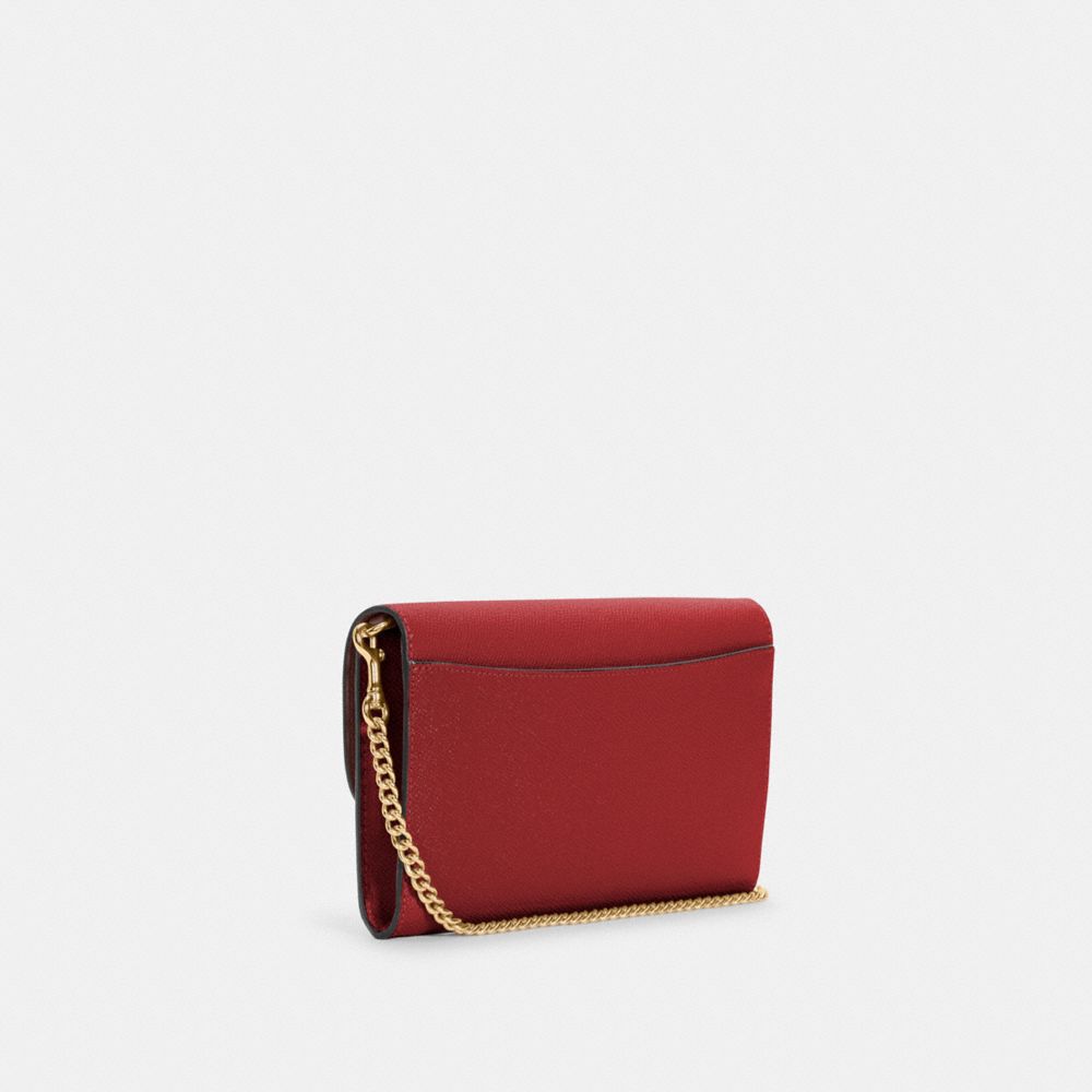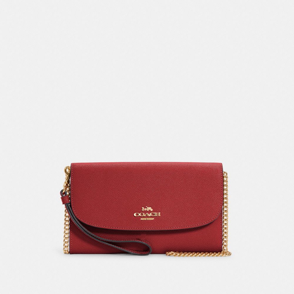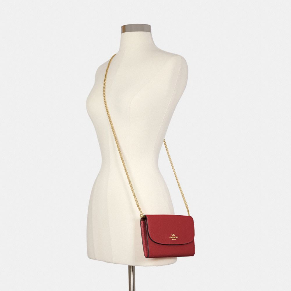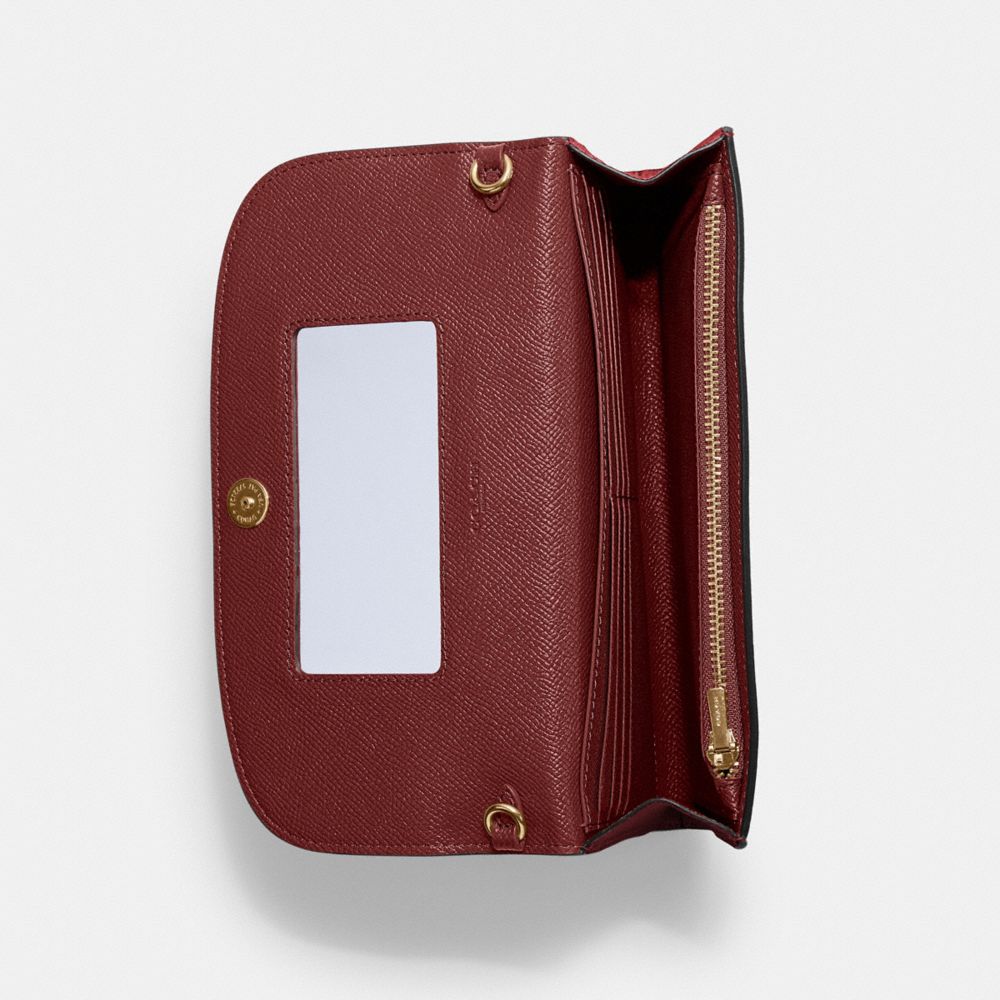 Crossgrain leather| Eight credit card slots| Full-length bill compartment| Inside zip and multifunction pockets| Inside mirror| Snap closure| Outside open pocket| Detachable wrist strap| Detachable chain strap with 23" drop for shoulder or crossbody wear| 7 3/4" (L) x 5" (H) x 1" (W)