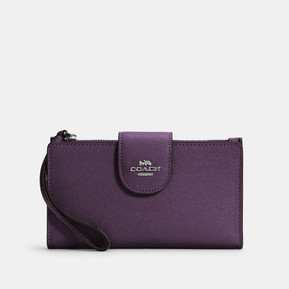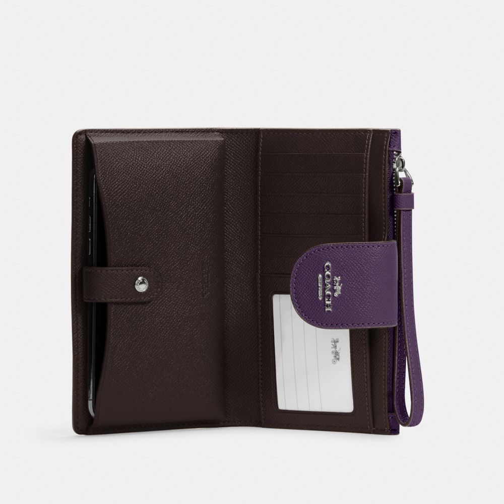 Crossgrain leather| Six credit card slots| ID window| Snap phone compartment| Snap closure| Outside zip pocket| Attached wrist strap| 7 1/4" (L) x 4 1/2" (H)| Fits all iPhone and Samsung Galaxy phones