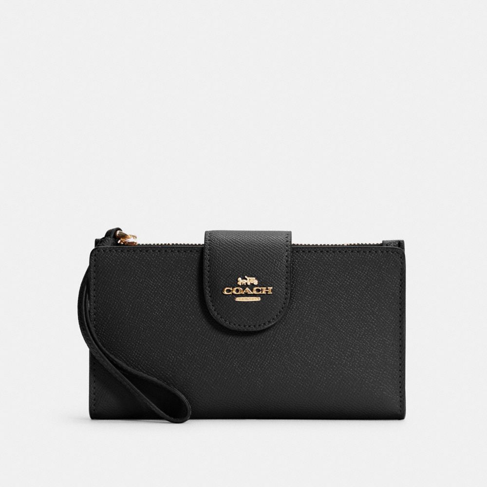 Crossgrain leather| Six credit card slots| ID window| Snap phone compartment| Snap closure| Outside zip pocket| Attached wrist strap| 7 1/4" (L) x 4 1/2" (H)
