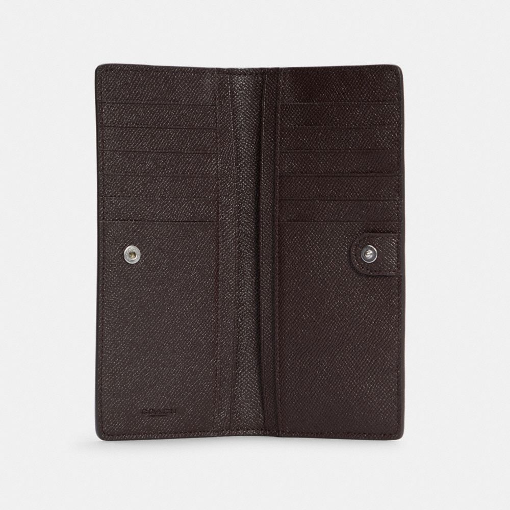 Crossgrain leather| 12 credit card slots| Full-length bill compartments| Snap closure| Outside zip pocket| Wrist strap attached| 7 1/4" (L) x 3 1/2" (H) x 1/2 (W)