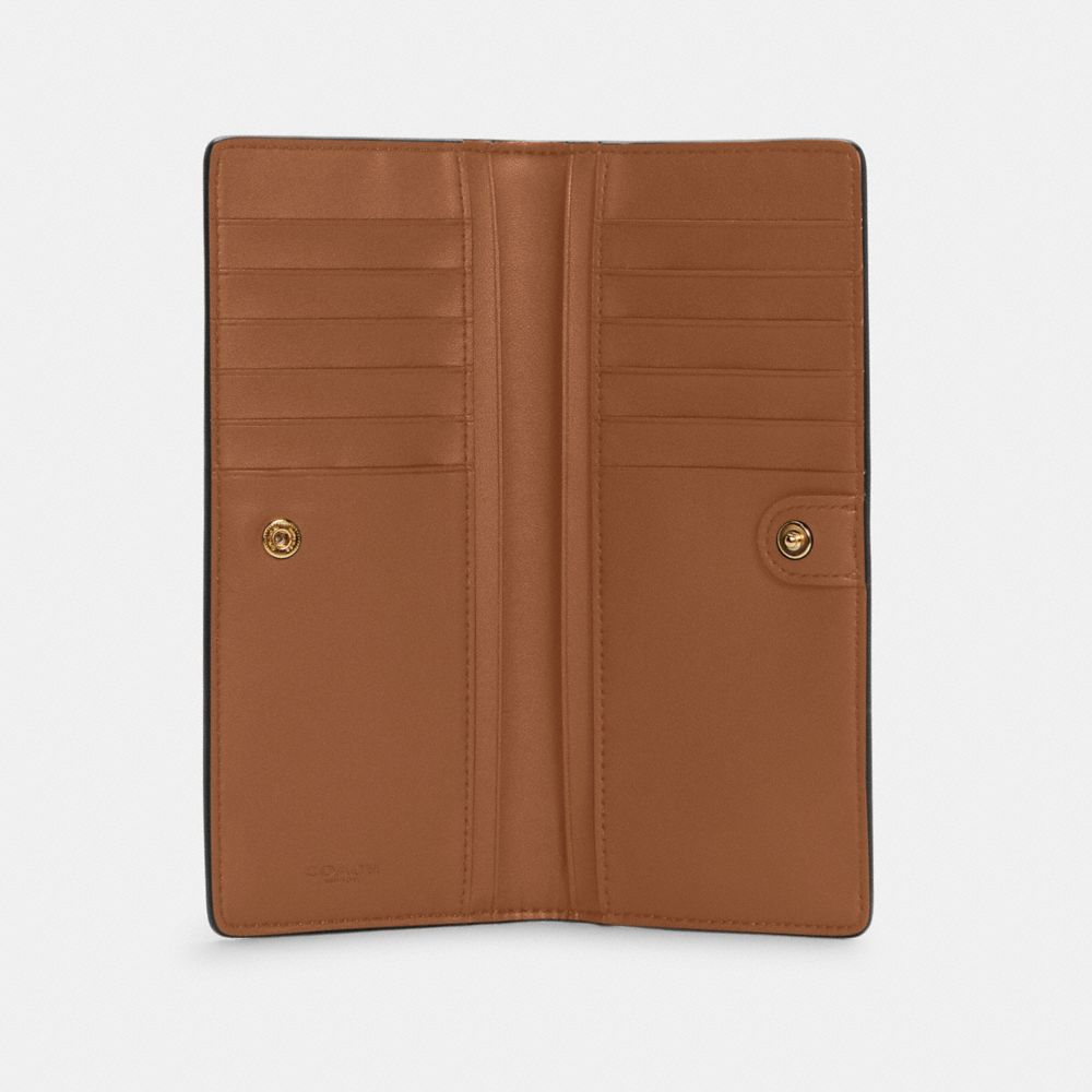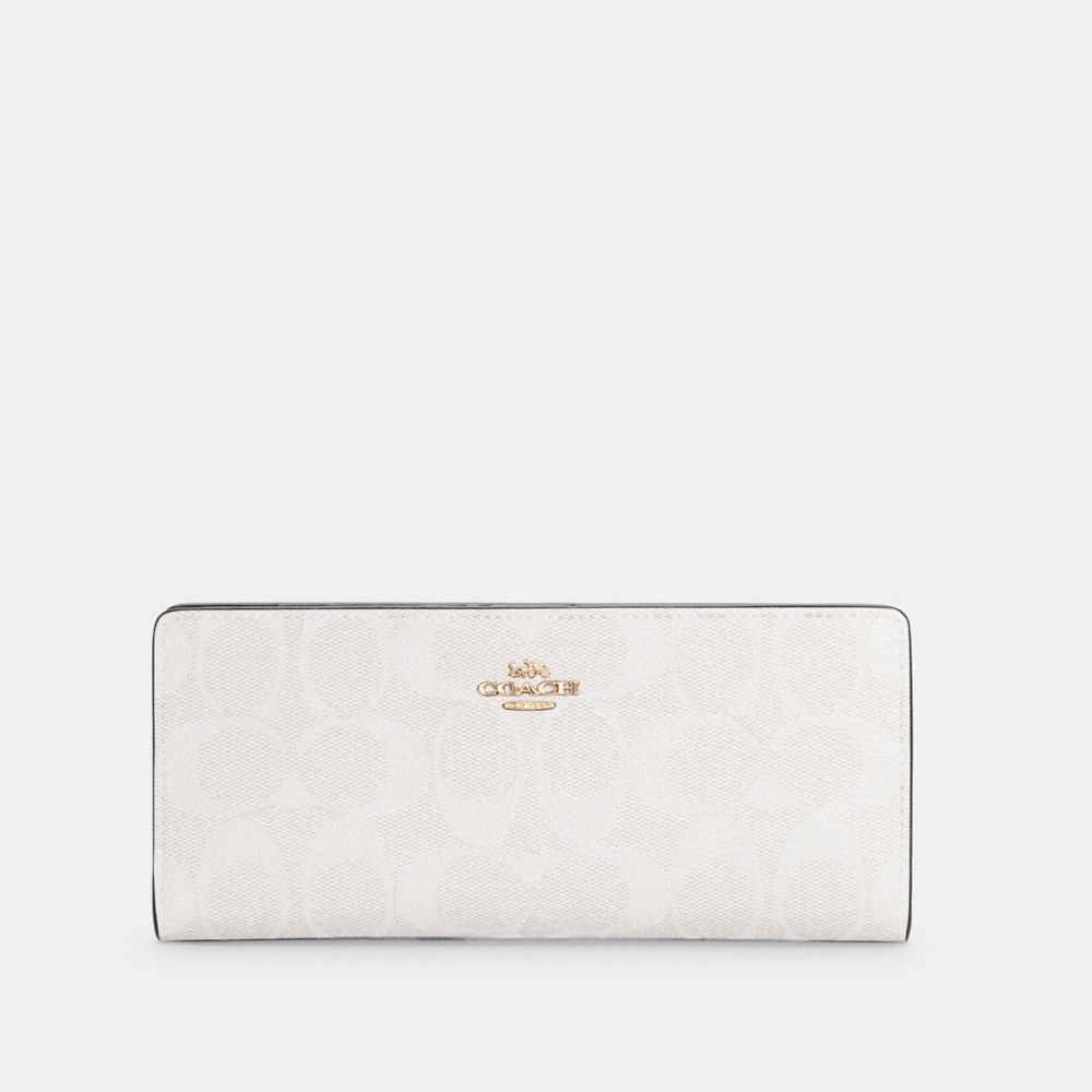 Signature coated canvas and smooth leather| 12 credit card slots| Full-length bill compartments| Snap closure| Outside zip pocket| Wrist strap attached| 7 1/4" (L) x 3 1/2" (H) x 1/2 (W)