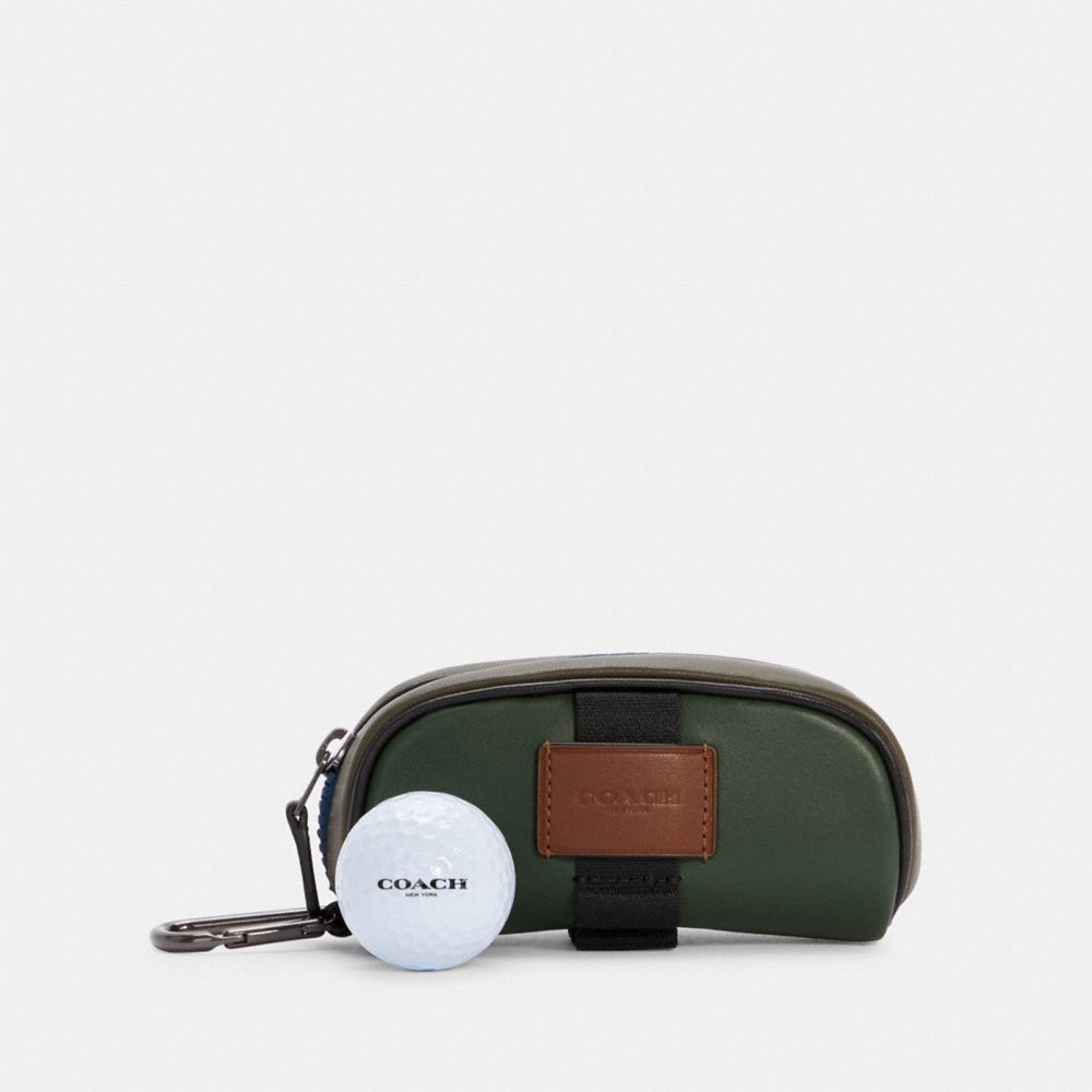 Smooth calf leather| Inside open pocket| Zip closure, fabric lining| Removable carabiner clip| 5 1/4" (L) x 2 1/2" (H) x 2" (W)| Includes three balls, two wooden tees and metal divot tool