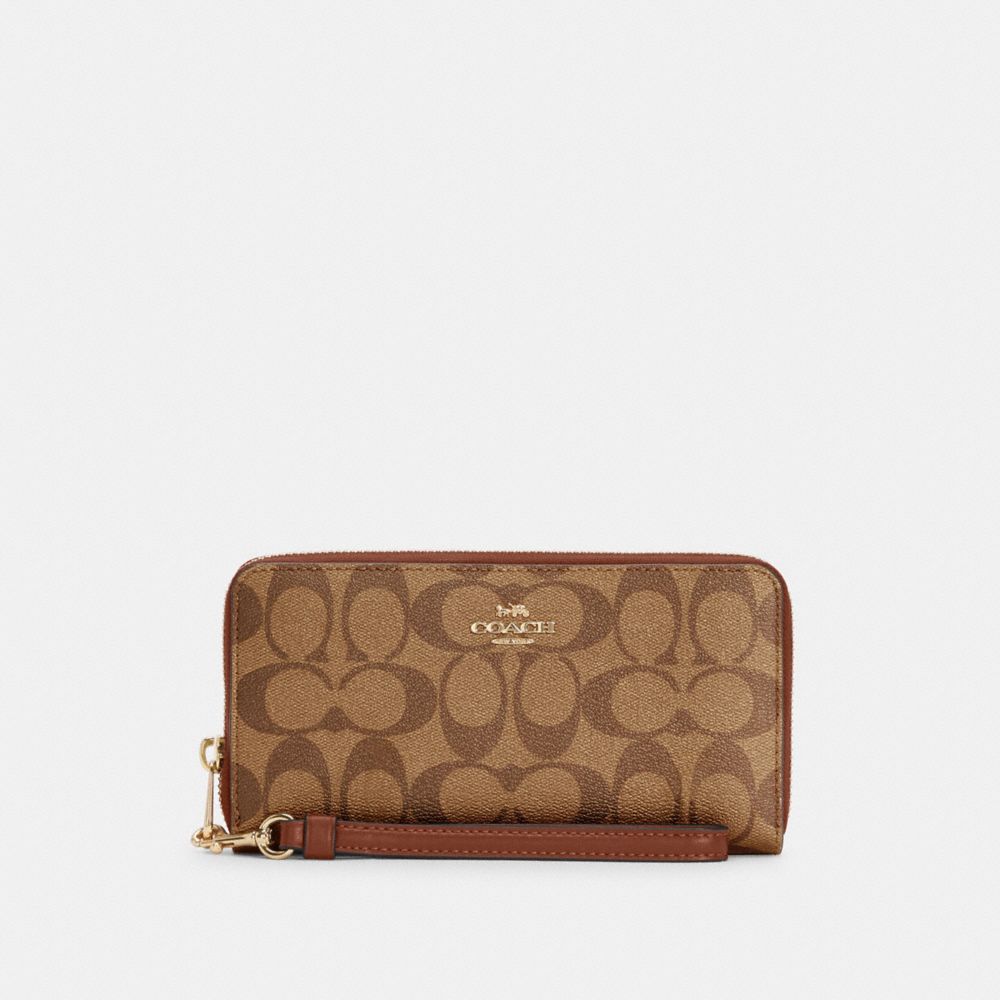 Signature coated canvas and smooth leather| Twelve credit card slots| Full-length bill compartments| Inside zip coin pocket| Zip-around closure| Detachable wrist strap| 7 1/2" (L) x 4" (H) x 1" (W)
