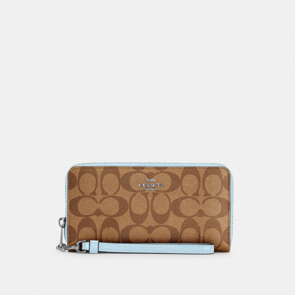 Signature coated canvas and smooth leather| Twelve credit card slots| Full-length bill compartments| Inside zip coin pocket| Zip-around closure| Detachable wrist strap| 7 1/2" (L) x 4" (H) x 1" (W)