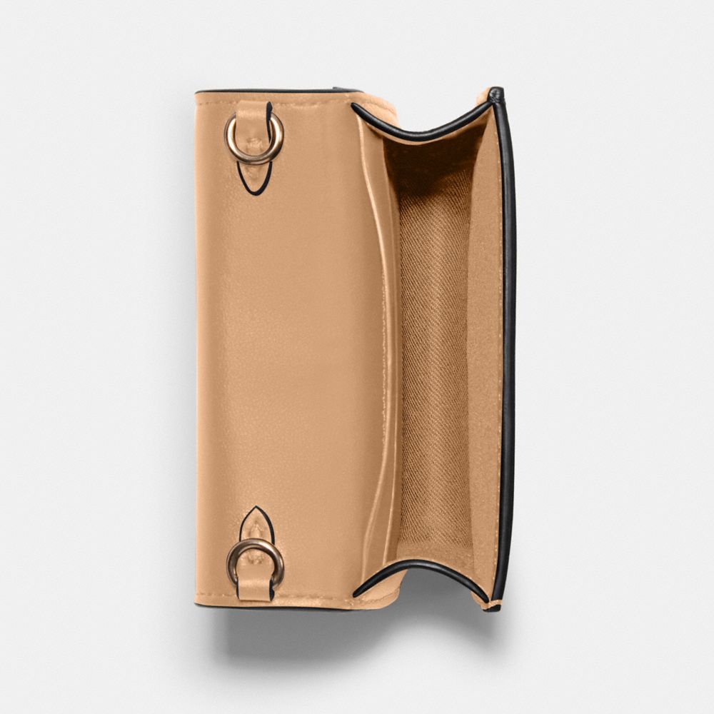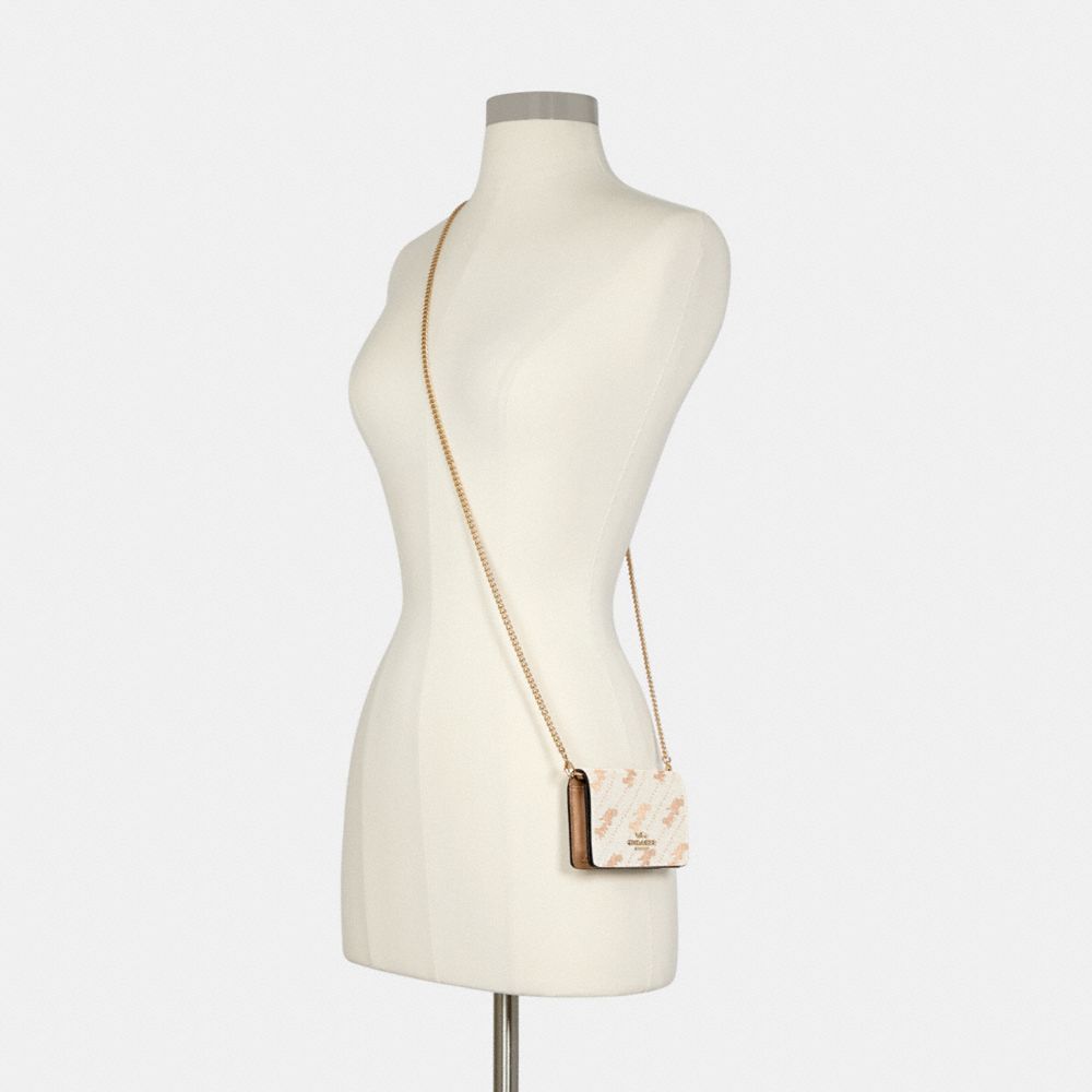 Printed coated canvas and smooth leather| Two credit card slots| Snap closure, fabric lining| Outside open pocket| Detachable chain strap with 23 1/4" drop for shoulder or crossbody wear| 4" (L) x 3" (H) x 1" (W)