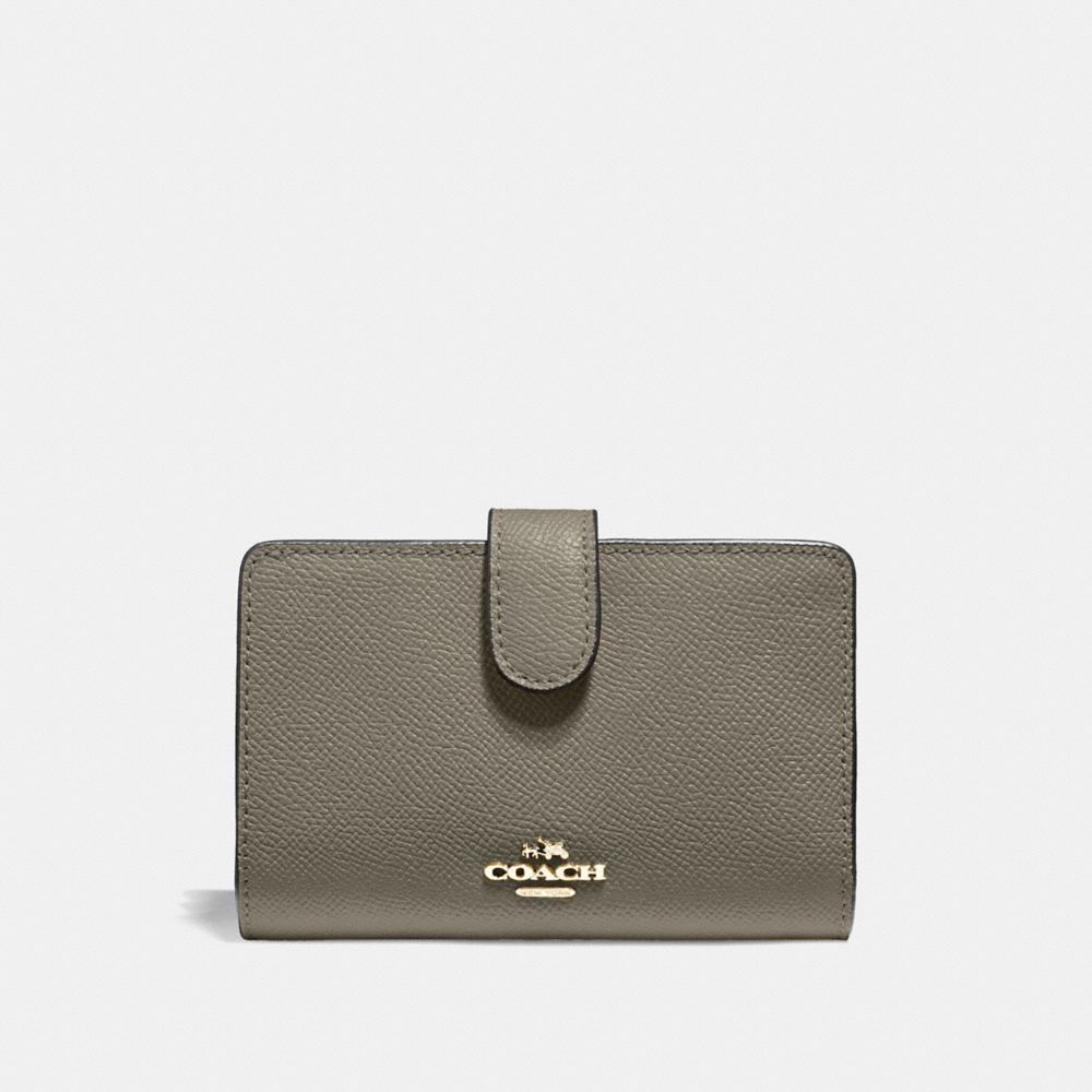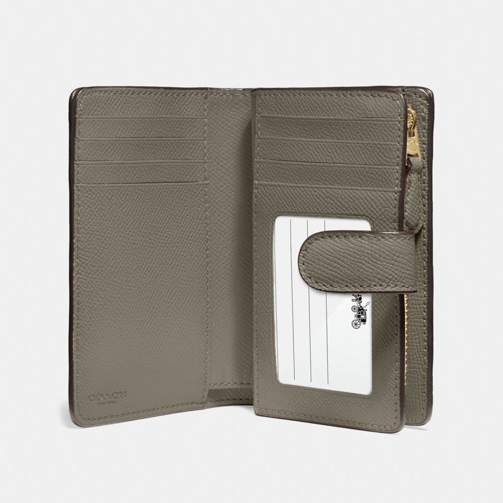 Crossgrain leather| Seven credit card slots| Bill compartment| ID window| Zip pocket| Snap closure| 5" (L) x 3 1/2" (H) x 1/2" (W)