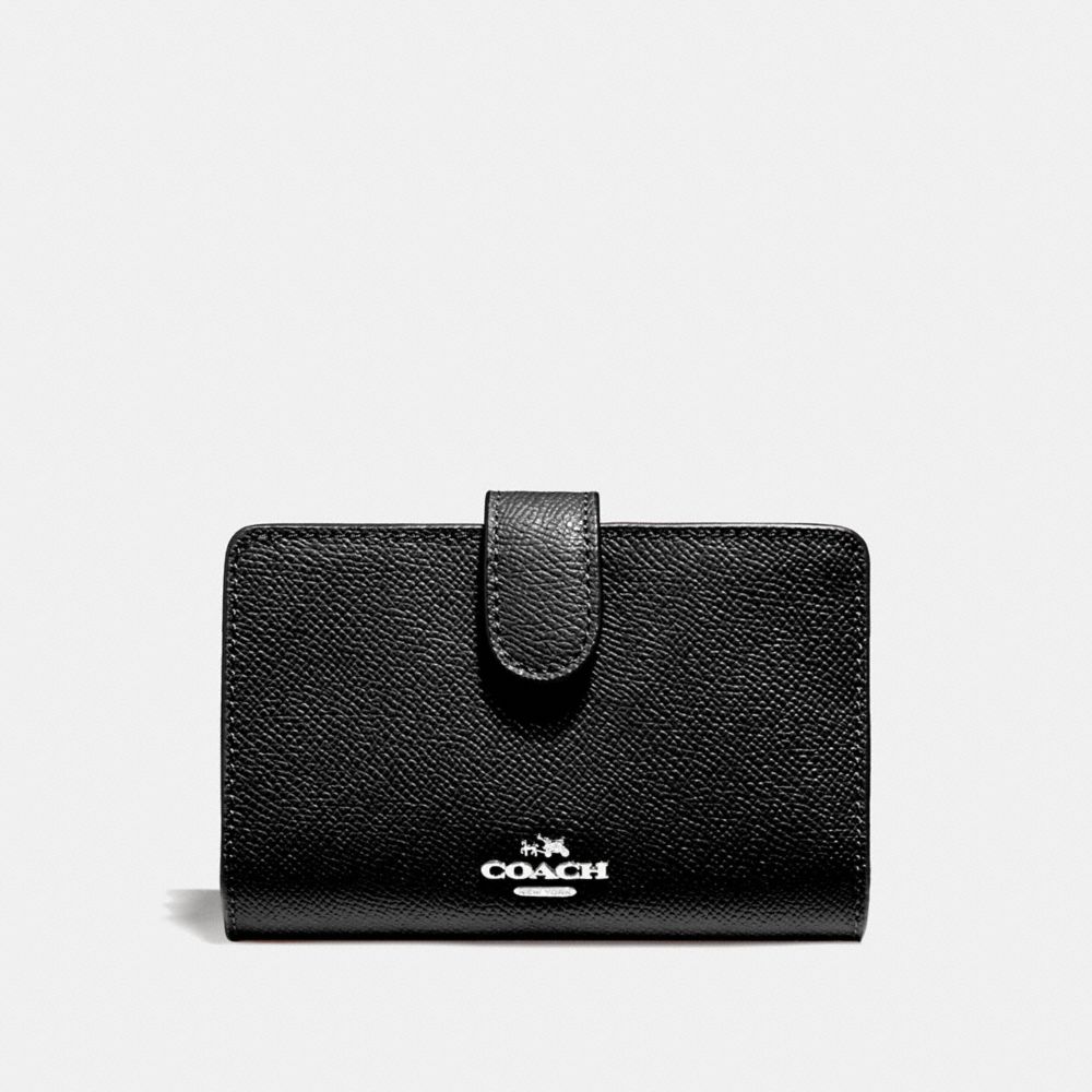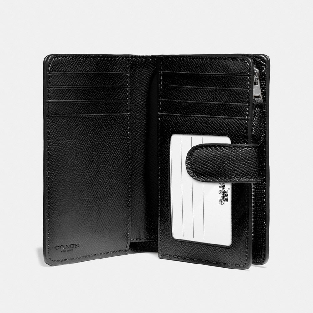 Crossgrain leather| Seven credit card slots| Bill compartment| ID window| Zip pocket| Snap closure| 5" (L) x 3 1/2" (H) x 1/2" (W)