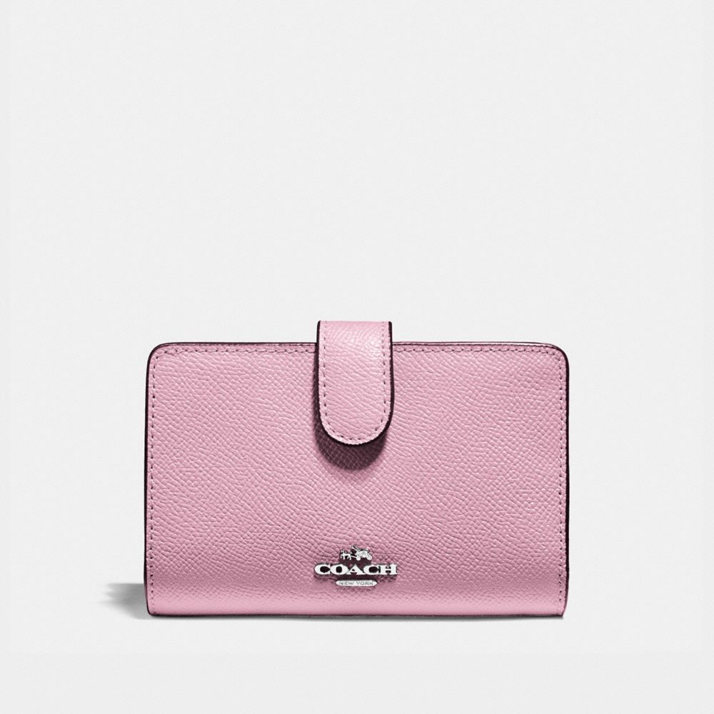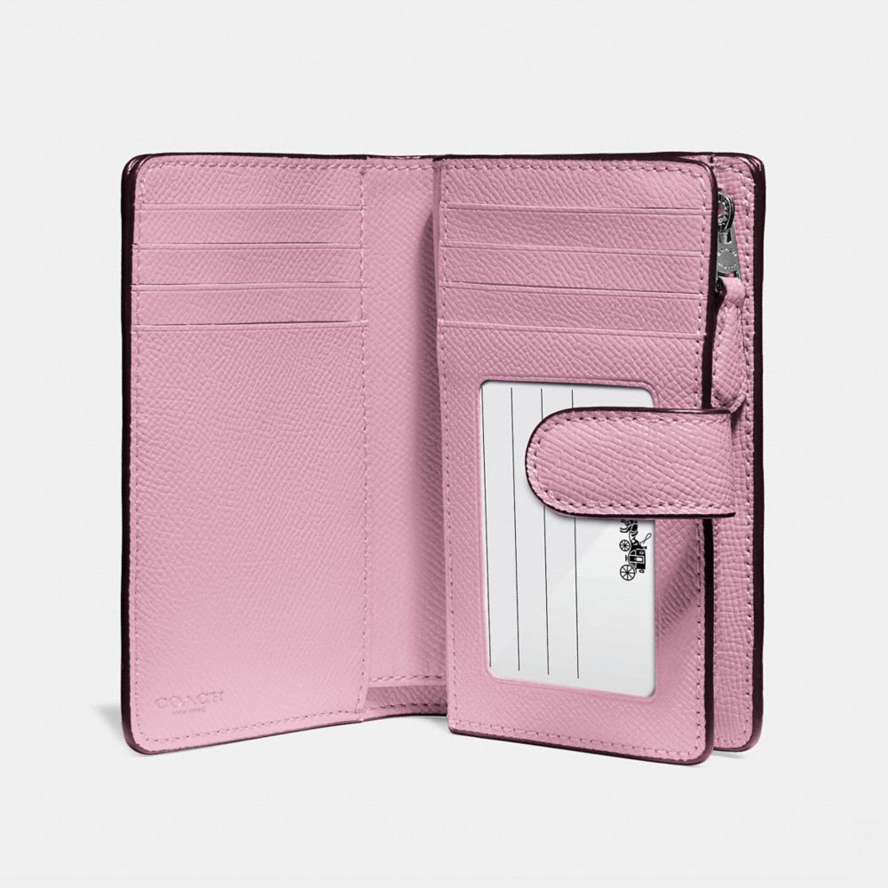 Crossgrain leather| Seven credit card slots| Bill compartment| ID window| Zip pocket| Snap closure| 5" (L) x 3 1/2" (H) x 1/2" (W)
