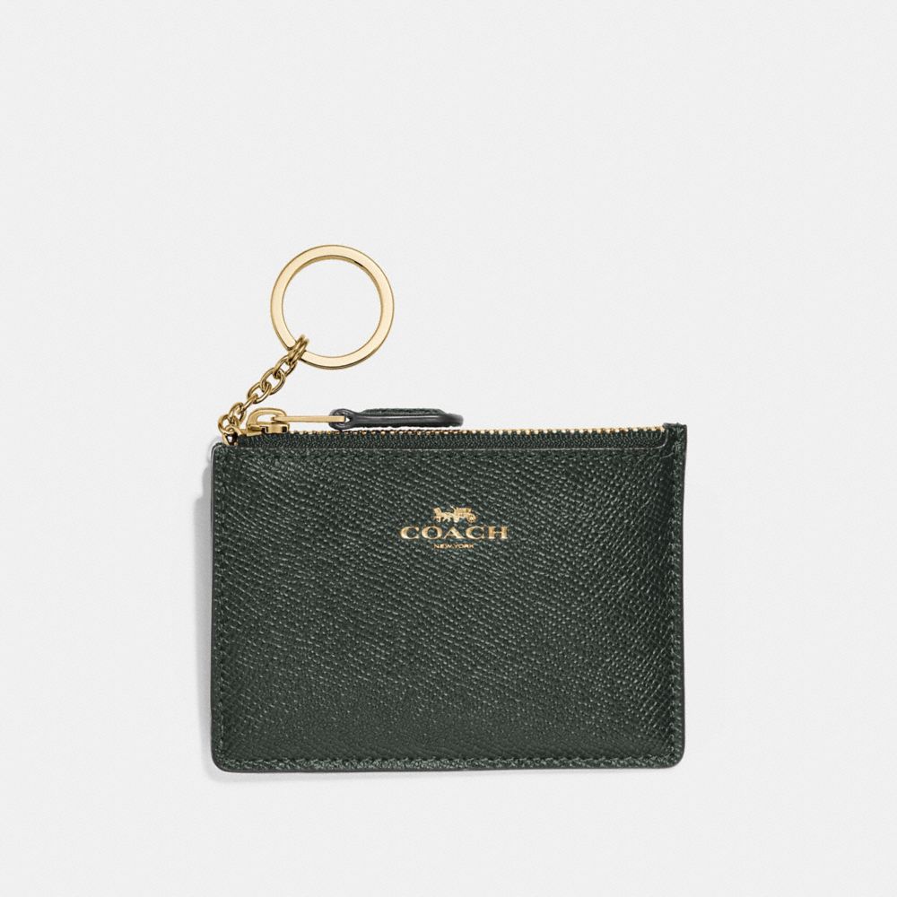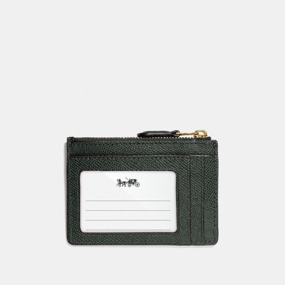 | Crossgrain leather| Credit card slot and ID window| Zip-top closure, fabric lining| Attached split key ring| 4 1/4" (L) x 3" (H) x 1/2" (W)