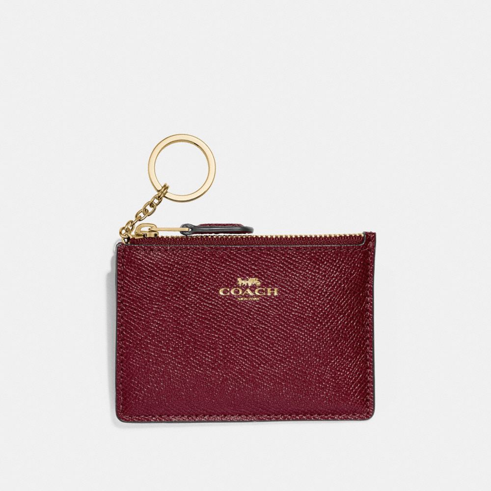 | Crossgrain leather| Credit card slot and ID window| Zip-top closure, fabric lining| Attached split key ring| 4 1/4" (L) x 3" (H) x 1/2" (W)