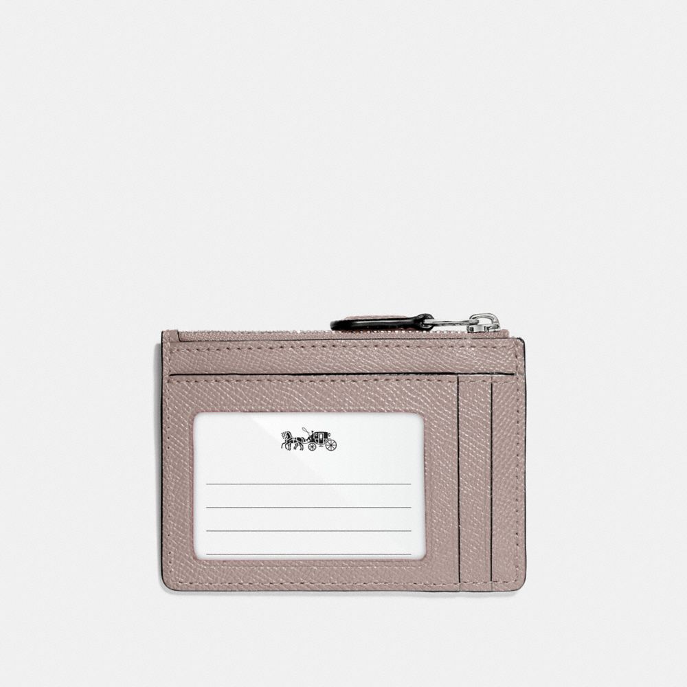 Crossgrain leather| Credit card slot and ID window| Zip-top closure, fabric lining| Attached split key ring| 4 1/4" (L) x 3" (H) x 1/2" (W)