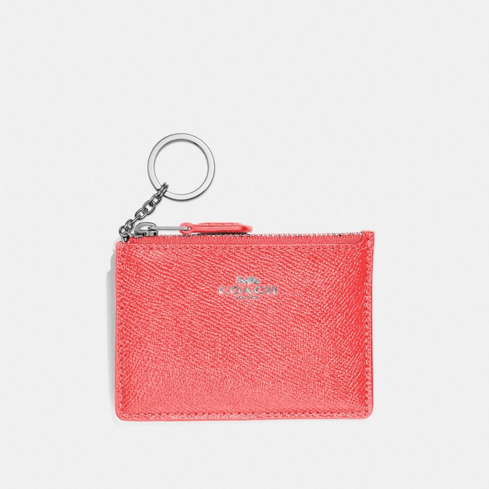 | Crossgrain leather| Credit card slot and ID window| Zip-top closure, fabric lining| Attached split key ring| 4 1/4" (L) x 3" (H) x 1/2" (W)
