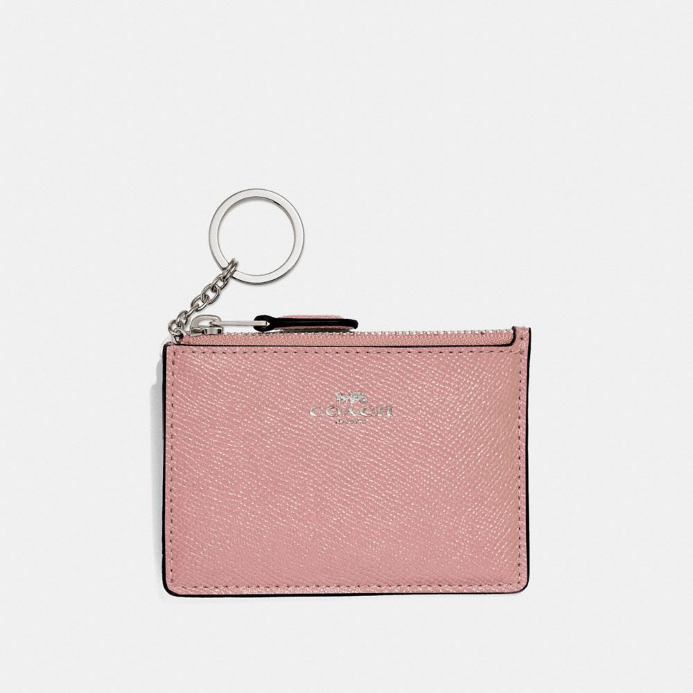 | Crossgrain leather| Credit card slot and ID window| Zip-top closure, fabric lining| Attached split key ring| 4 1/4" (L) x 3" (H) x 1/2" (W)