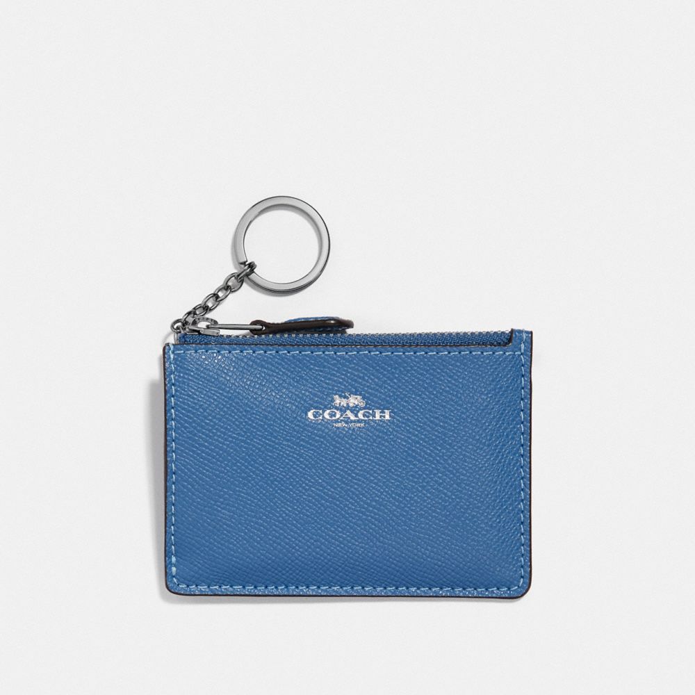 | Crossgrain leather| Credit card slot and ID window| Zip-top closure, fabric lining| Attached split key ring| 4 1/4" (L) x 3" (H) x 1/2" (W)