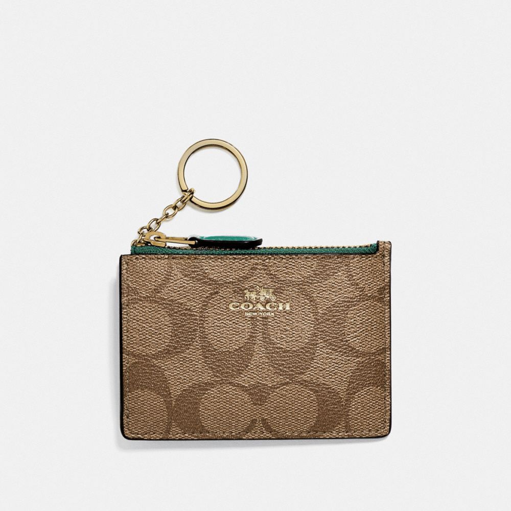 | Signature coated canvas| Credit card slot and ID window| Zip-top closure, fabric lining| Attached split key ring| 4 1/4" (L) x 3" (H) x 1/2" (W)