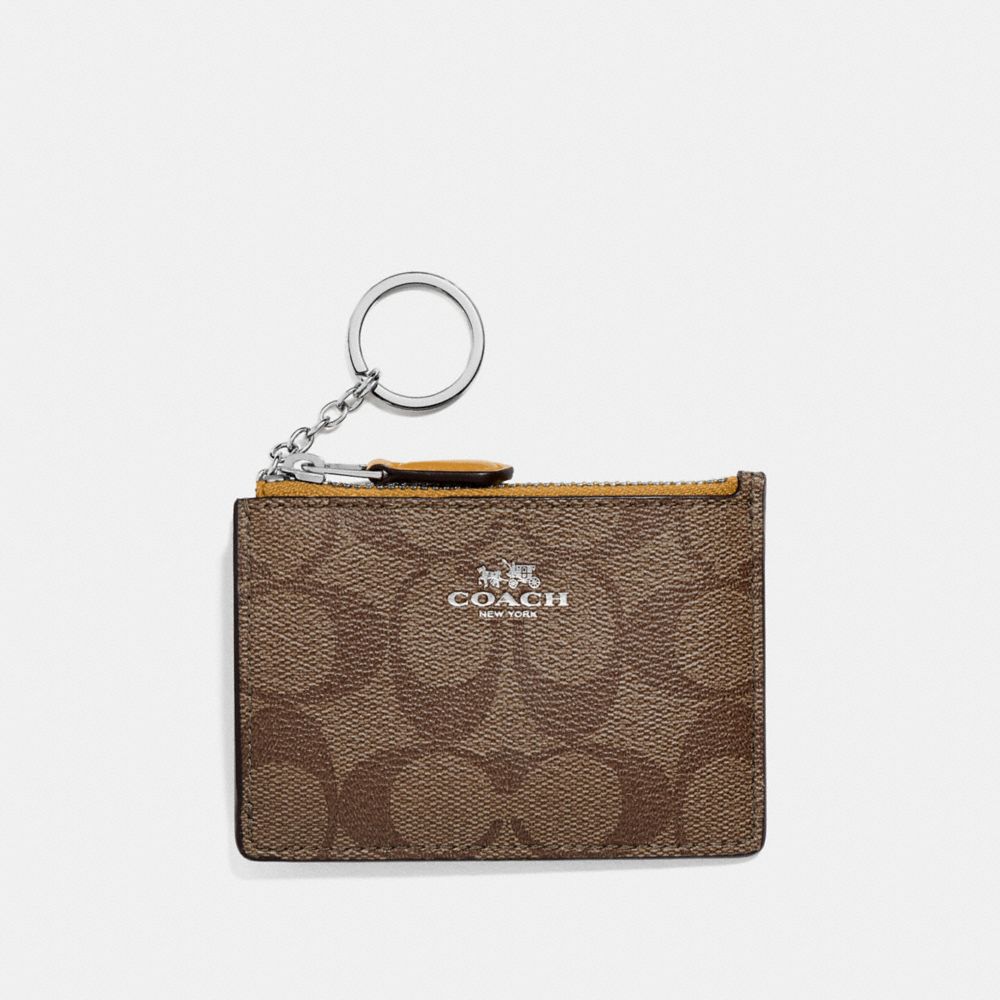| Signature coated canvas| Credit card slot and ID window| Zip-top closure, fabric lining| Attached split key ring| 4 1/4" (L) x 3" (H) x 1/2" (W)