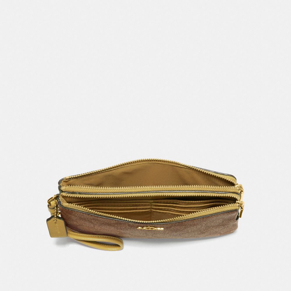 Signature coated canvas| Six credit card slots| Full-length bill compartment| Inside open pockets| Double zip closure, fabric lining| Wrist strap attached| 8" (L) x 4 3/4" (H) x 1 1/4"| Fits all phone sizes up to an iPhone X and Samsung S7 Edge
