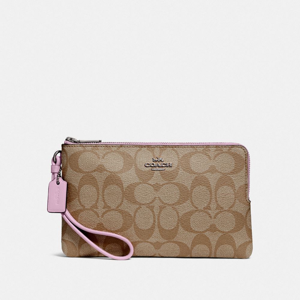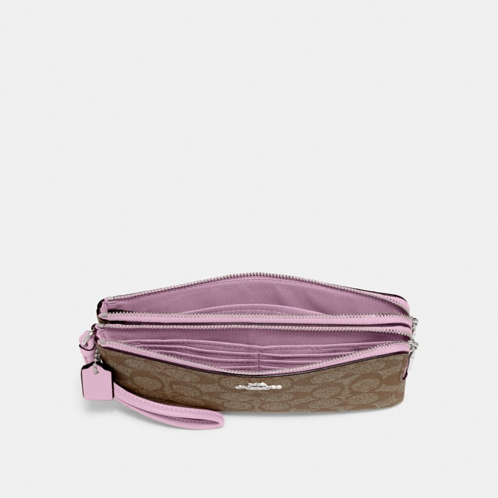 Signature coated canvas| Six credit card slots| Full-length bill compartment| Inside open pockets| Double zip closure, fabric lining| Wrist strap attached| 8 1/2" (L) x 4 1/2" (H) x 1 1/4" (W)| Fits all phone sizes up to an iPhone X and Samsung S7 Edge