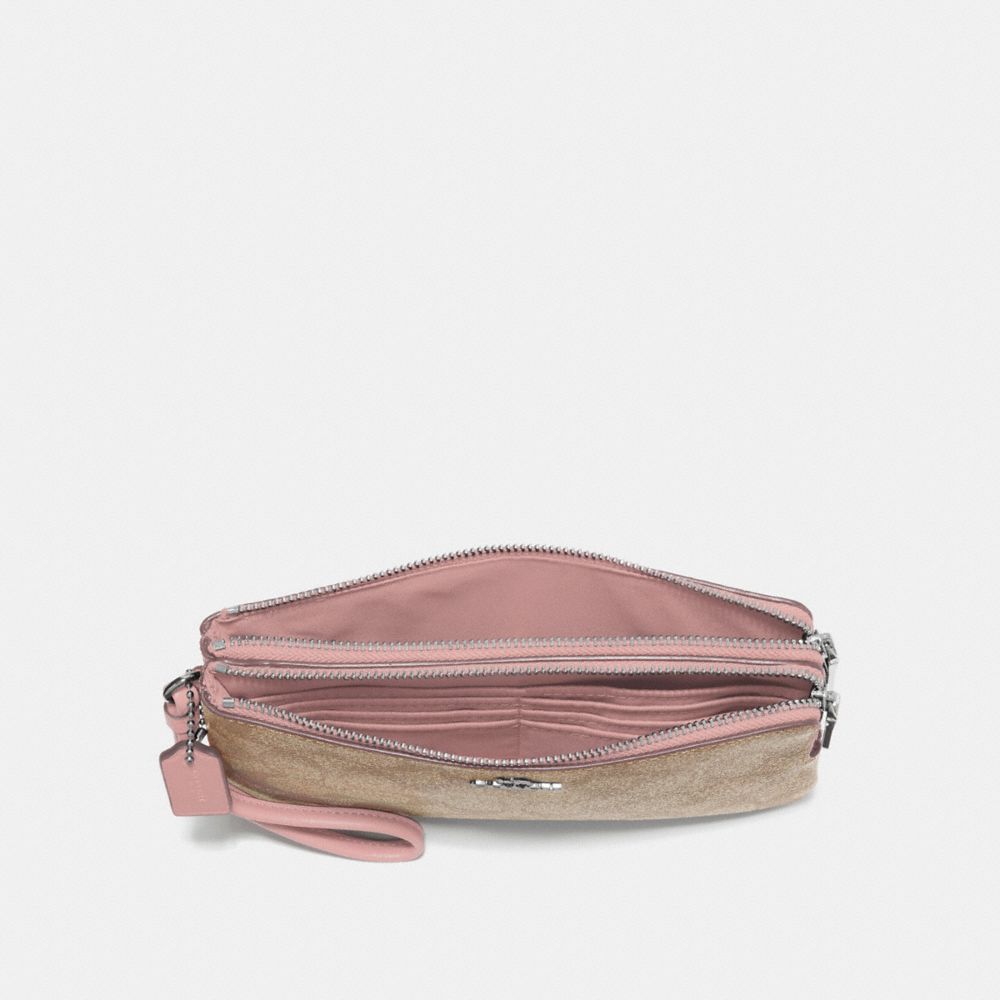 | Signature coated canvas| Six credit card slots| Full-length bill compartment| Inside open pockets| Double zip closure, fabric lining| Wrist strap attached| 8" (L) x 4 3/4" (H) x 1 1/4"| Fits all phone sizes up to an iPhone X and Samsung S7 Edge