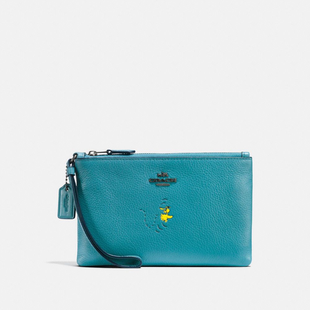 Refined natural pebble leather| Two credit card slots| Zip-top closure, fabric lining| Detachable wrist strap| 7 1/2" (L) x 4 3/4" (H)| Fits an iPhone or Android| Packaged in a Coach gift box| Limited-Edition Coach x Peanuts® collection