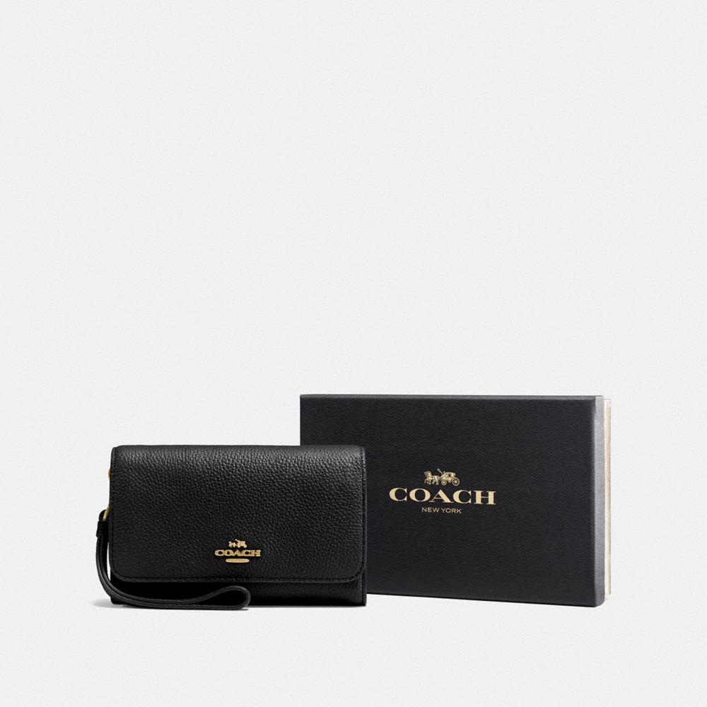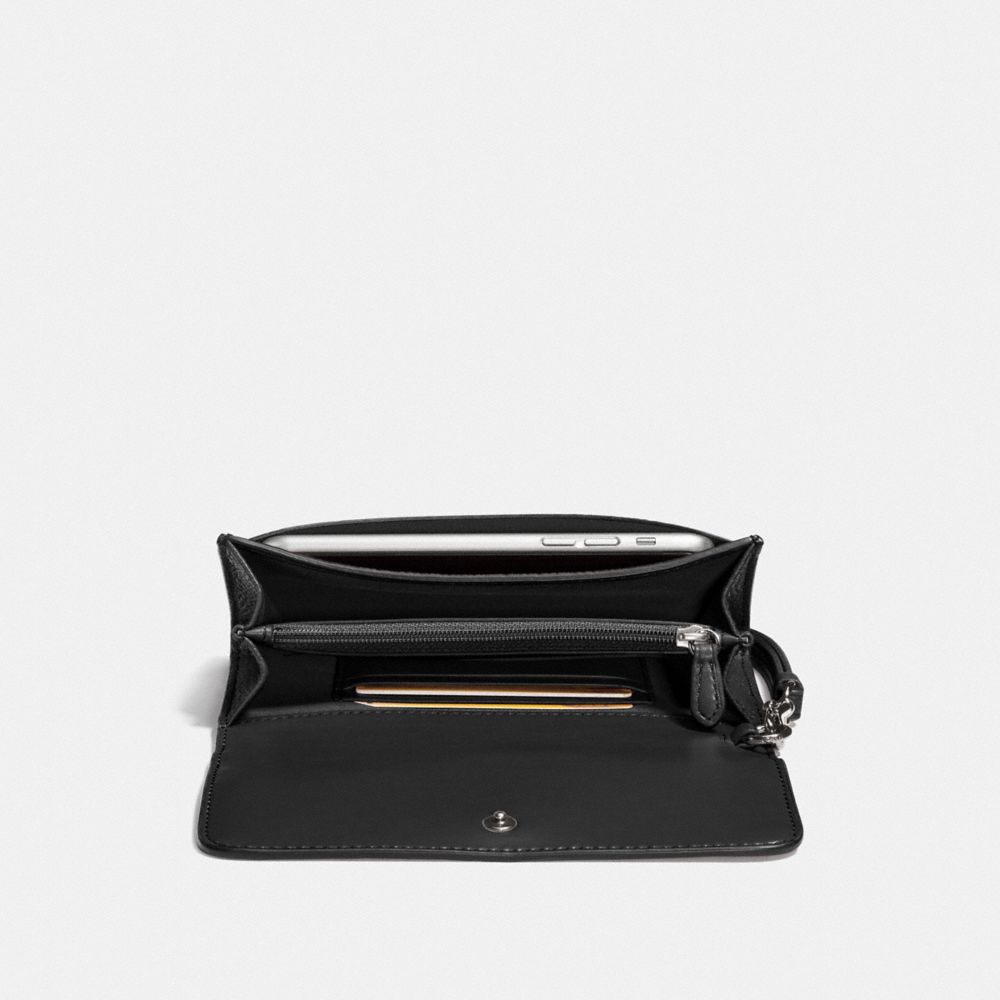 Polished pebble leather| Three credit card slots| Inside zip coin and cell phone pockets| Snap closure| Detachable wrist strap| Outside slip pocket| 6 1/2" (L) x 4" (H)| Packaged in a Coach gift box