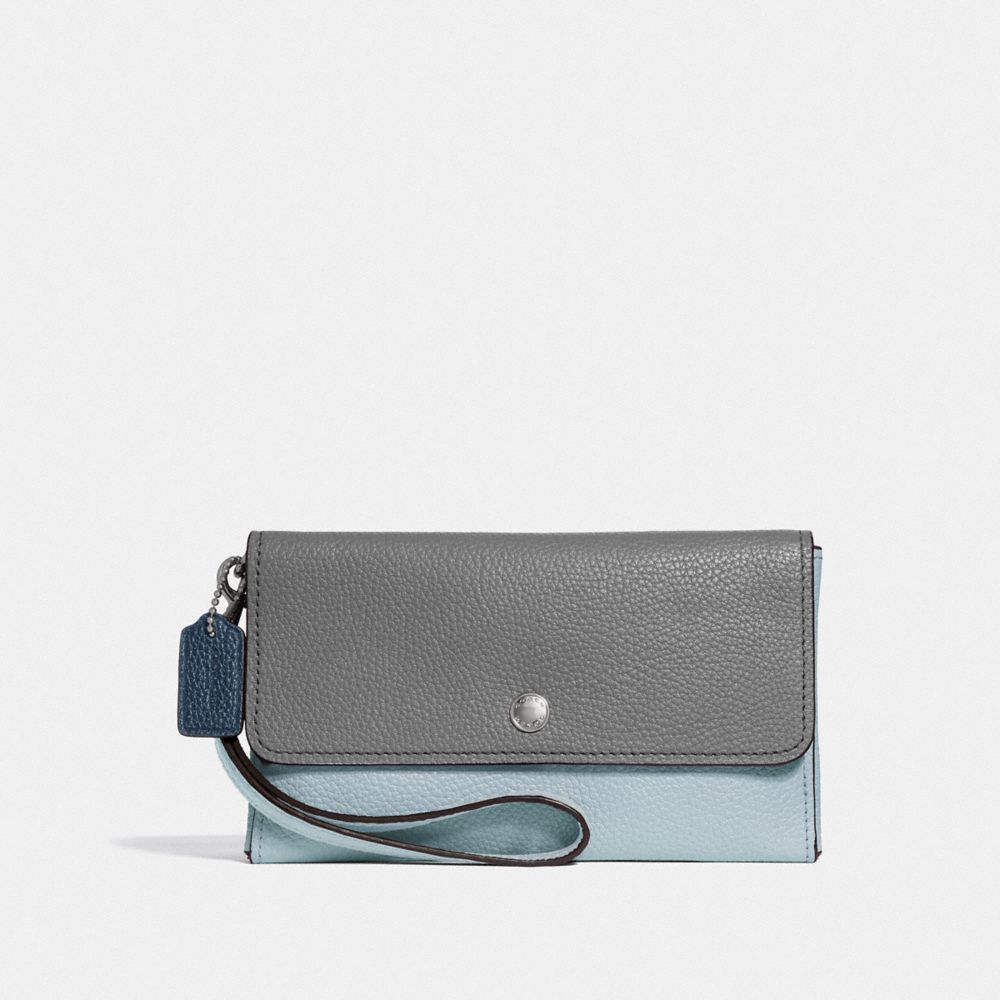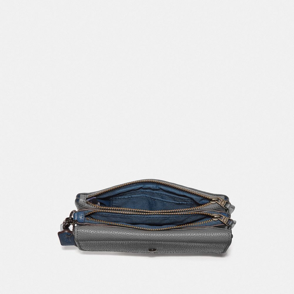 Polished pebble leather| Two credit card slots| Double zip and snap closures| Detachable wrist strap| 6 3/4" (L) x 4" (H)