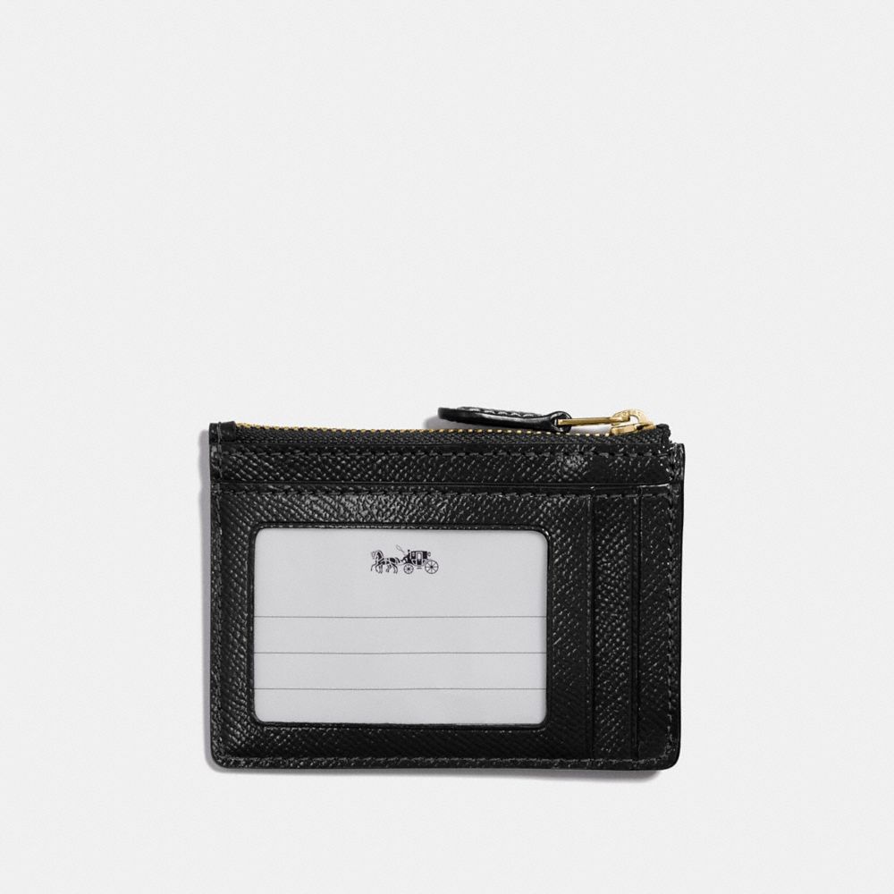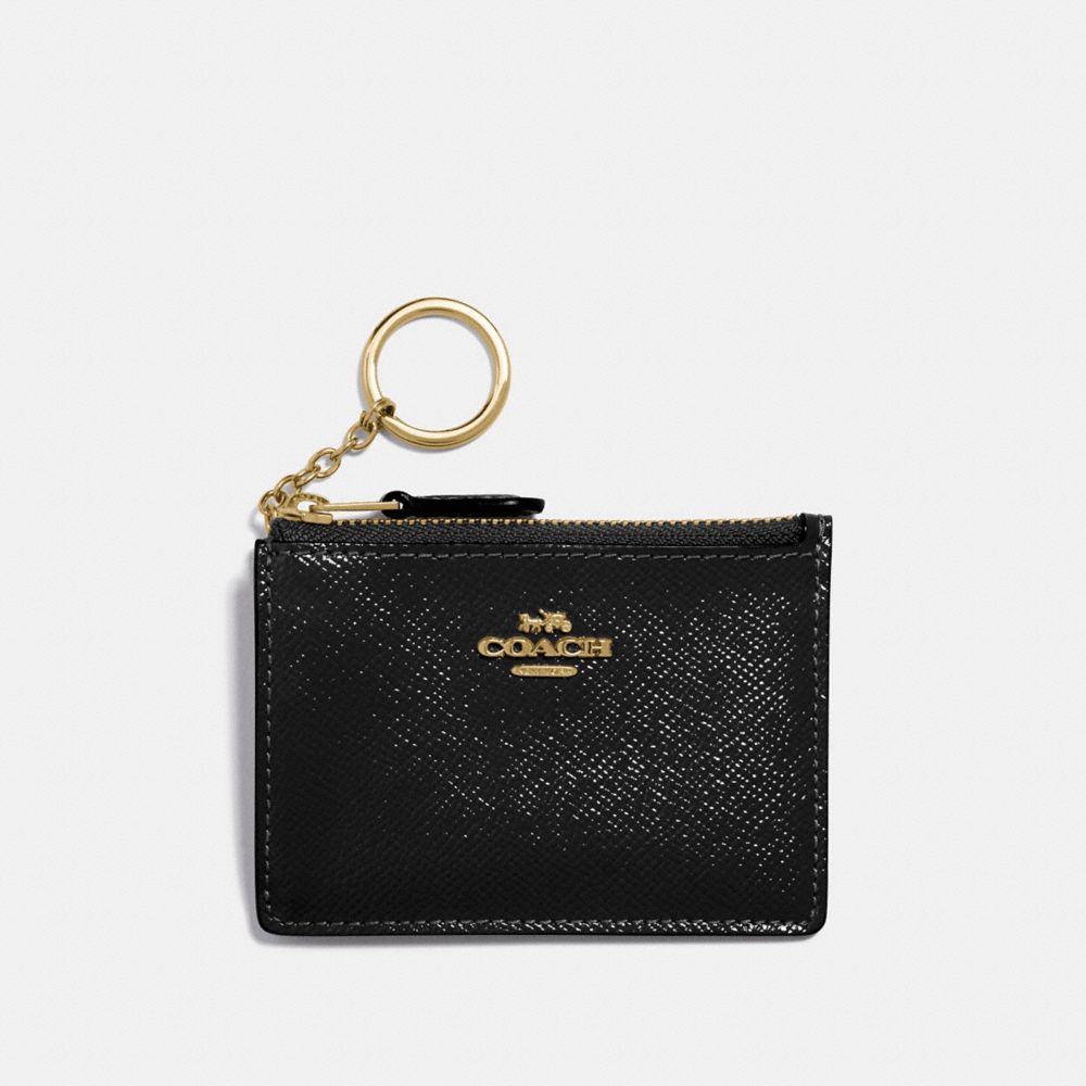 Patent crossgrain leather| Credit card slot and ID window| Zip-top closure, fabric lining| Attached split key ring| 4 1/4" (L) x 3" (H) x 1/2" (W)