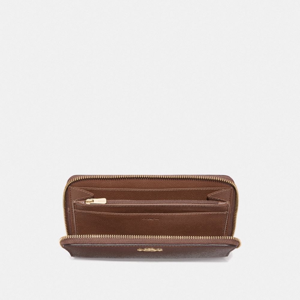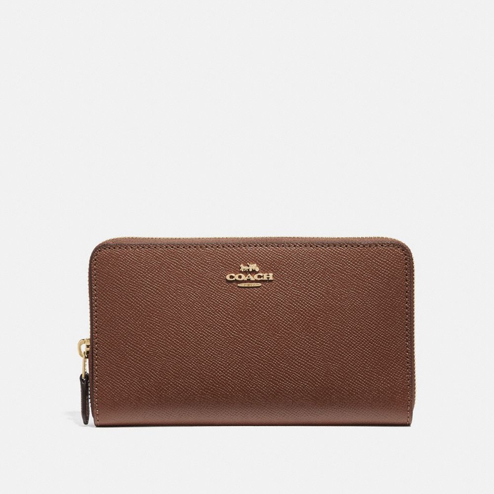 | Crossgrain leather| Seven credit card slots| Full-length bill compartments| ID window| Inside open pockets| Zip coin pocket| Zip-around closure| 7 3/4" (L) x 4 1/2" (H) x 3/4" (H)