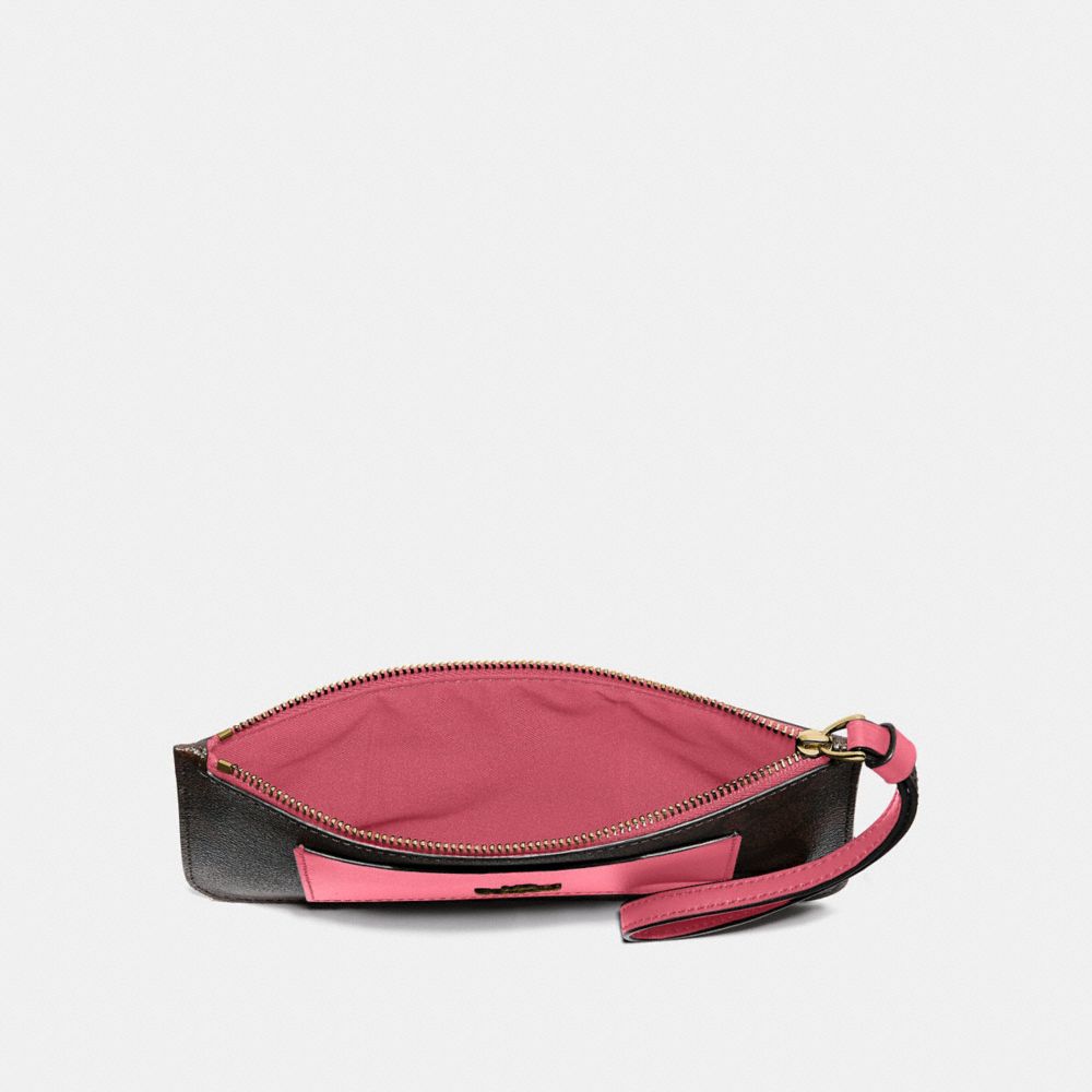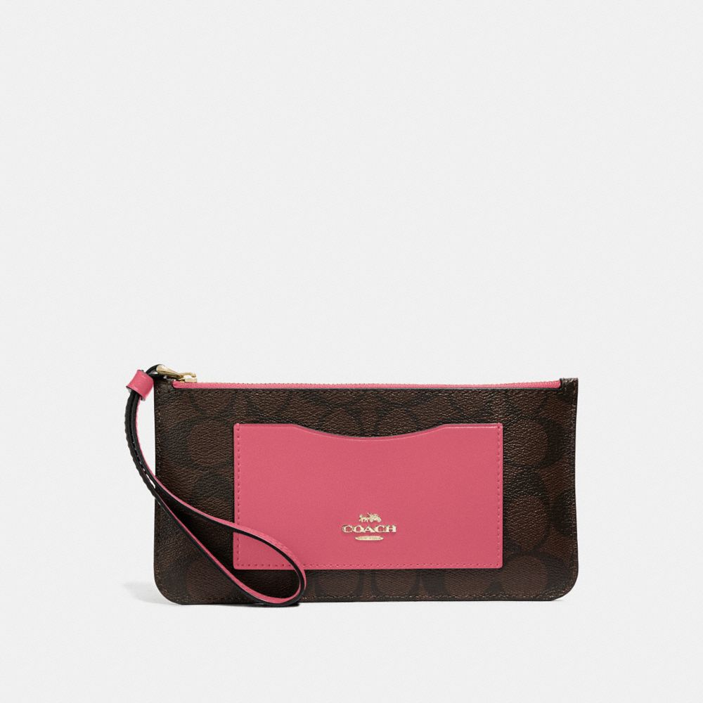 | Signature coated canvas with smooth leather details| Inside open compartment| Zip-top closure| Seven credit card slots| Full-length bill compartment| Attached wrist strap| 7 3/4" (L) x 4 1/4" (H) x 3/4" (W)