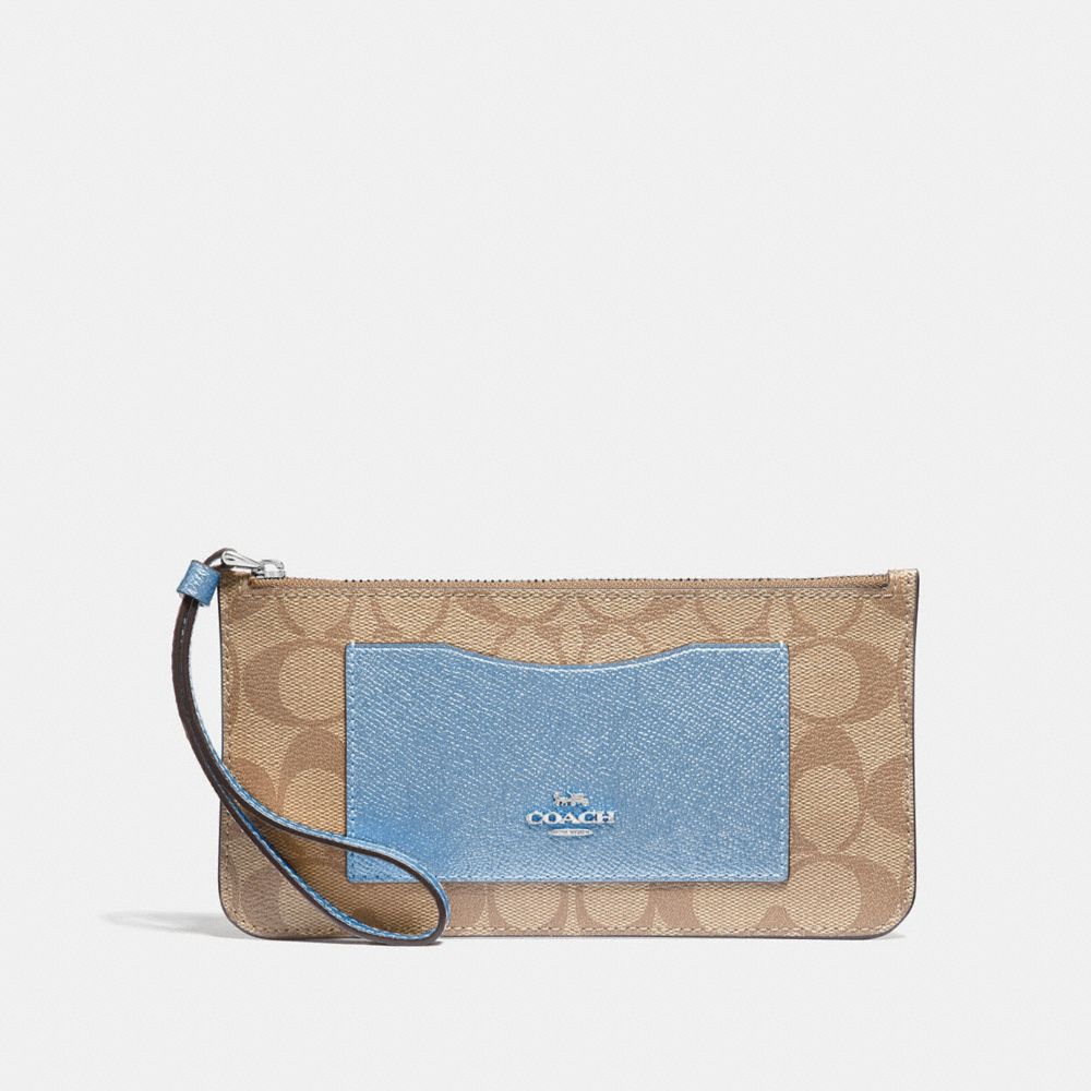 | Signature coated canvas with smooth leather details| Inside open compartment| Zip-top closure| Seven credit card slots| Full-length bill compartment| Wrist strap attached| 7 3/4" (L) x 4 1/4" (H) x 3/4" (W)