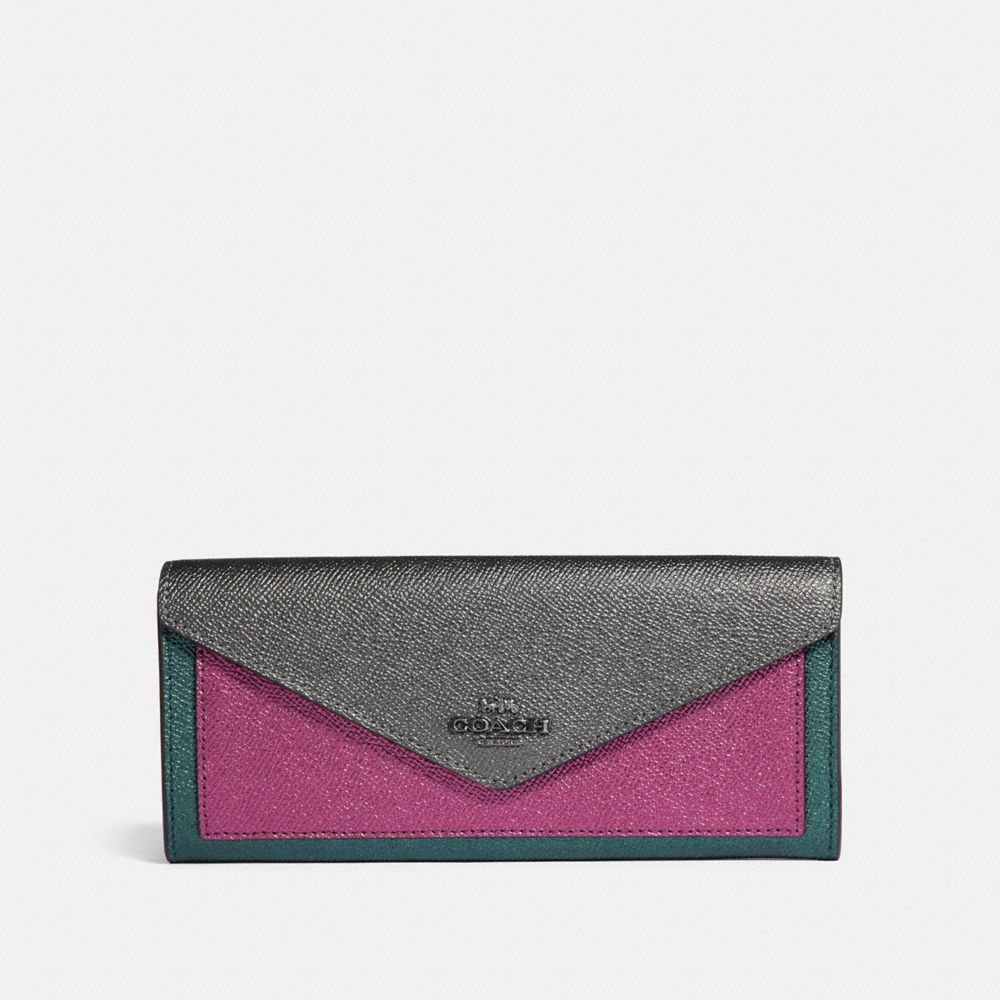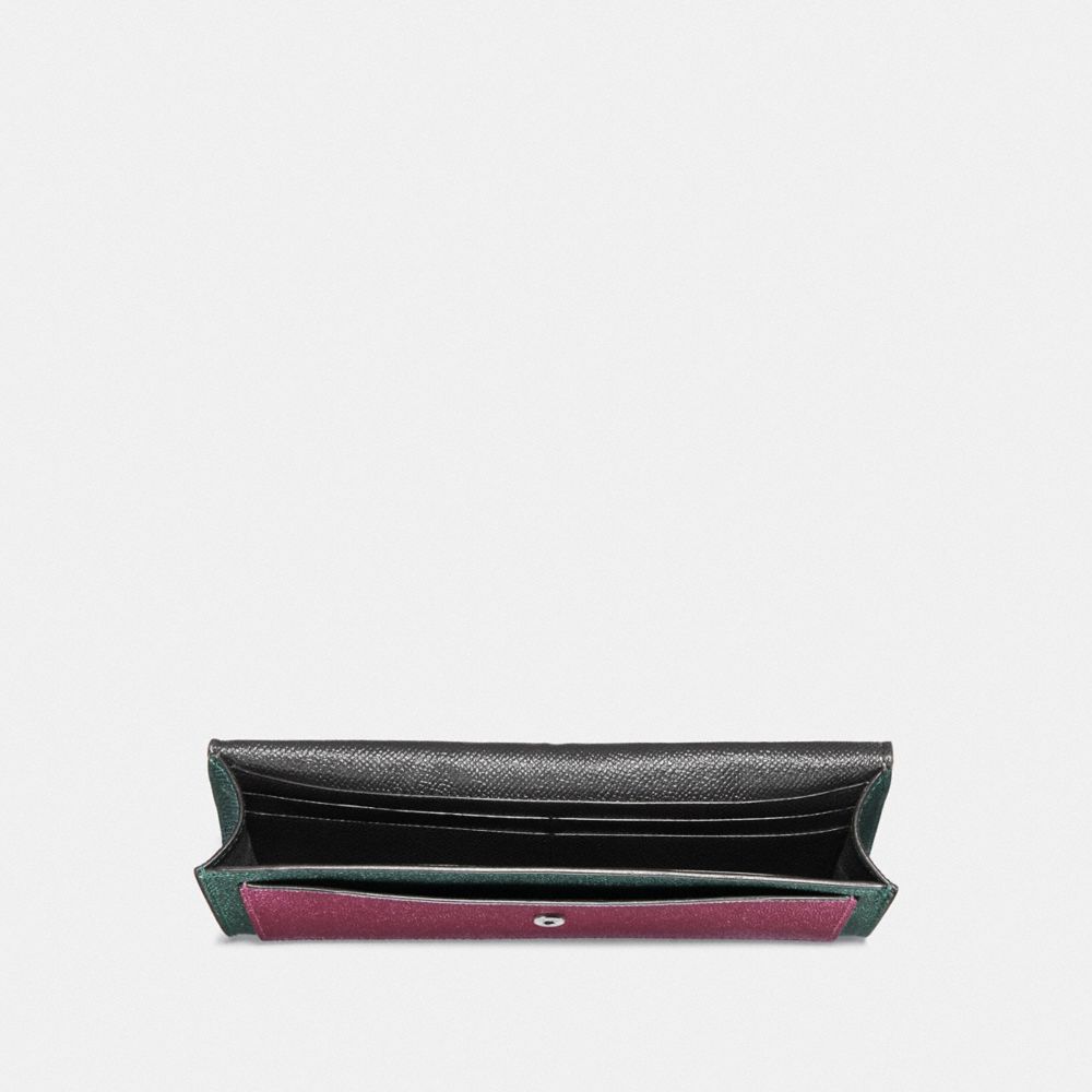 Metallic crossgrain leather| Eight credit card slots| Full-length bill compartment| Snap closure| Outside zip coin pocket| 7 3/4" (L) x 3 1/2" (H)