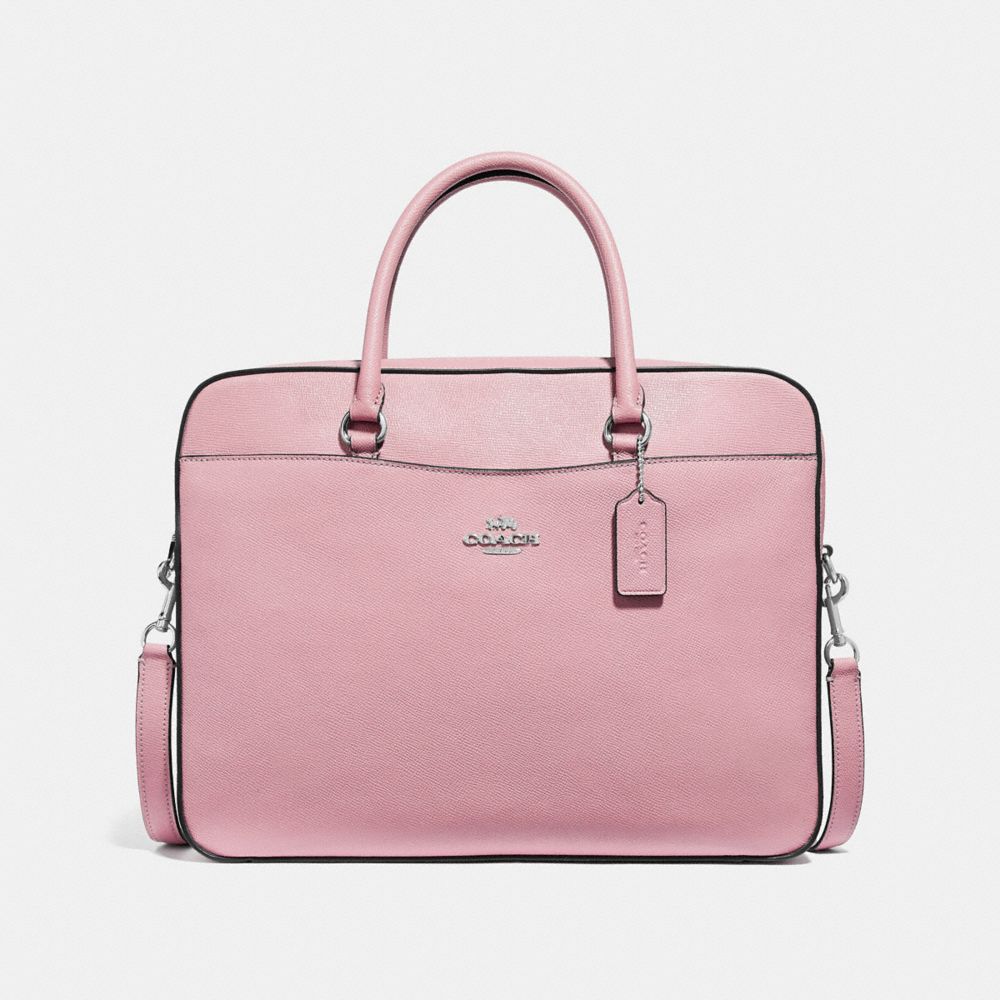 Crossgrain leather| Inside snap and multifunction pockets| Zip closure, fabric lining| Handles with 4 1/4" drop| Outside snap pockets| Detachable strap with 21 3/4" drop for shoulder or crossbody wear| 14 1/2" (L) x 11 1/4" (H) x 2 1/4" (W)