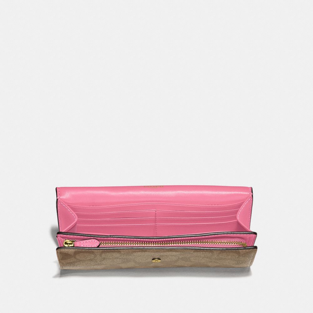 Signature coated canvas with crossgrain leather details| 12 credit card slots| Full-length bill compartment| Zip coin pocket| Snap closure | Outside open pocket| 7 3/4" (L) x 4" (H) x 3/4" (W)