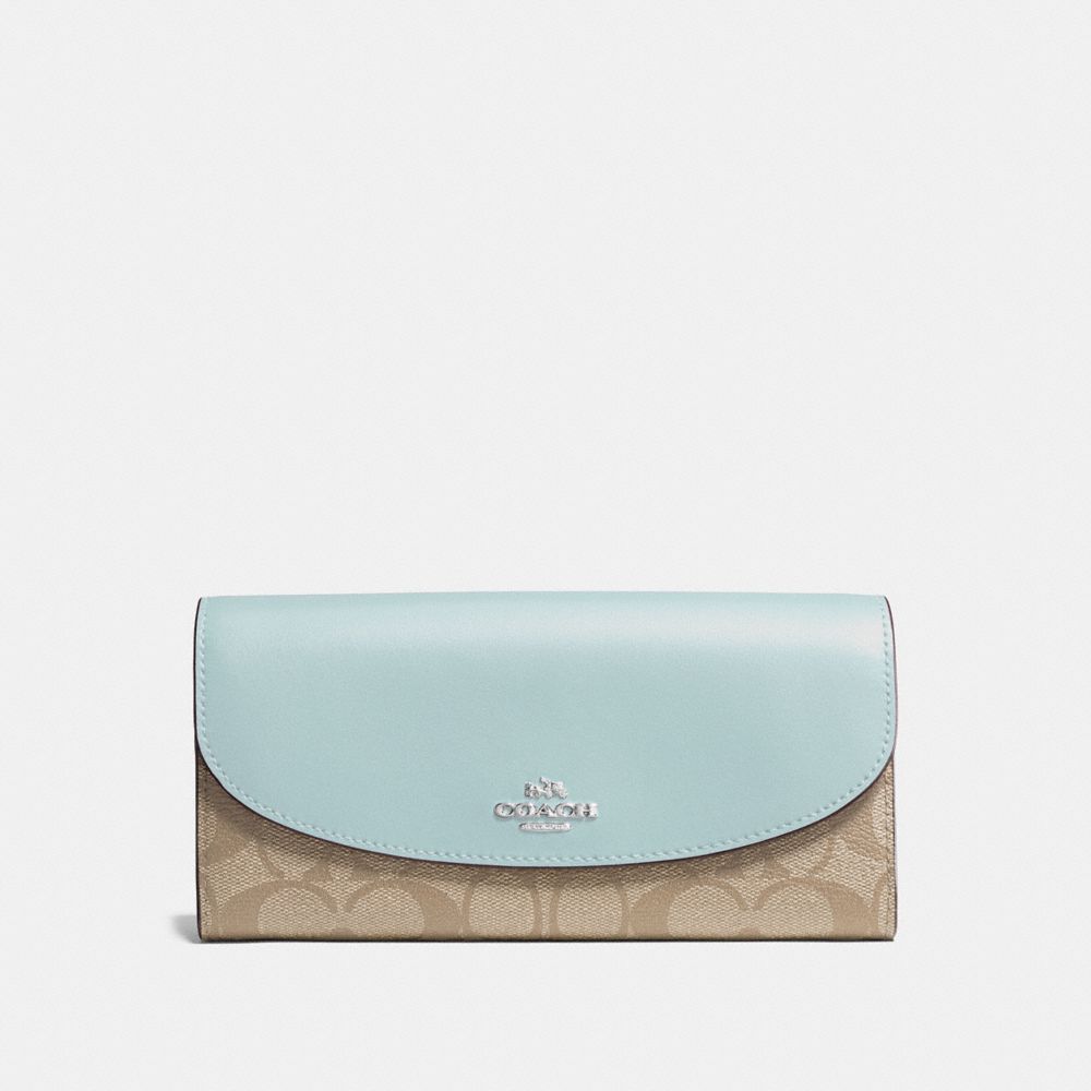Signature coated canvas with crossgrain leather details| 12 credit card slots| Full-length bill compartment| Zip coin pocket| Snap closure | Outside open pocket| 7 3/4" (L) x 4" (H) x 3/4" (W)