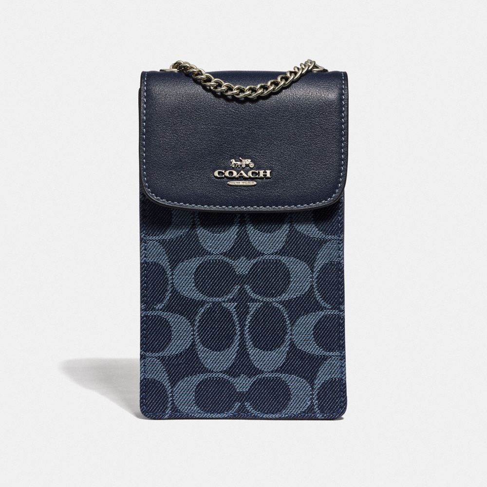 | Signature denim and smooth leather| Snap closure| Four outside credit card slots| Strap with 23" drop for shoulder or crossbody wear| 4 1/4" (L) x 7" (H) x 1 1/4" (W)