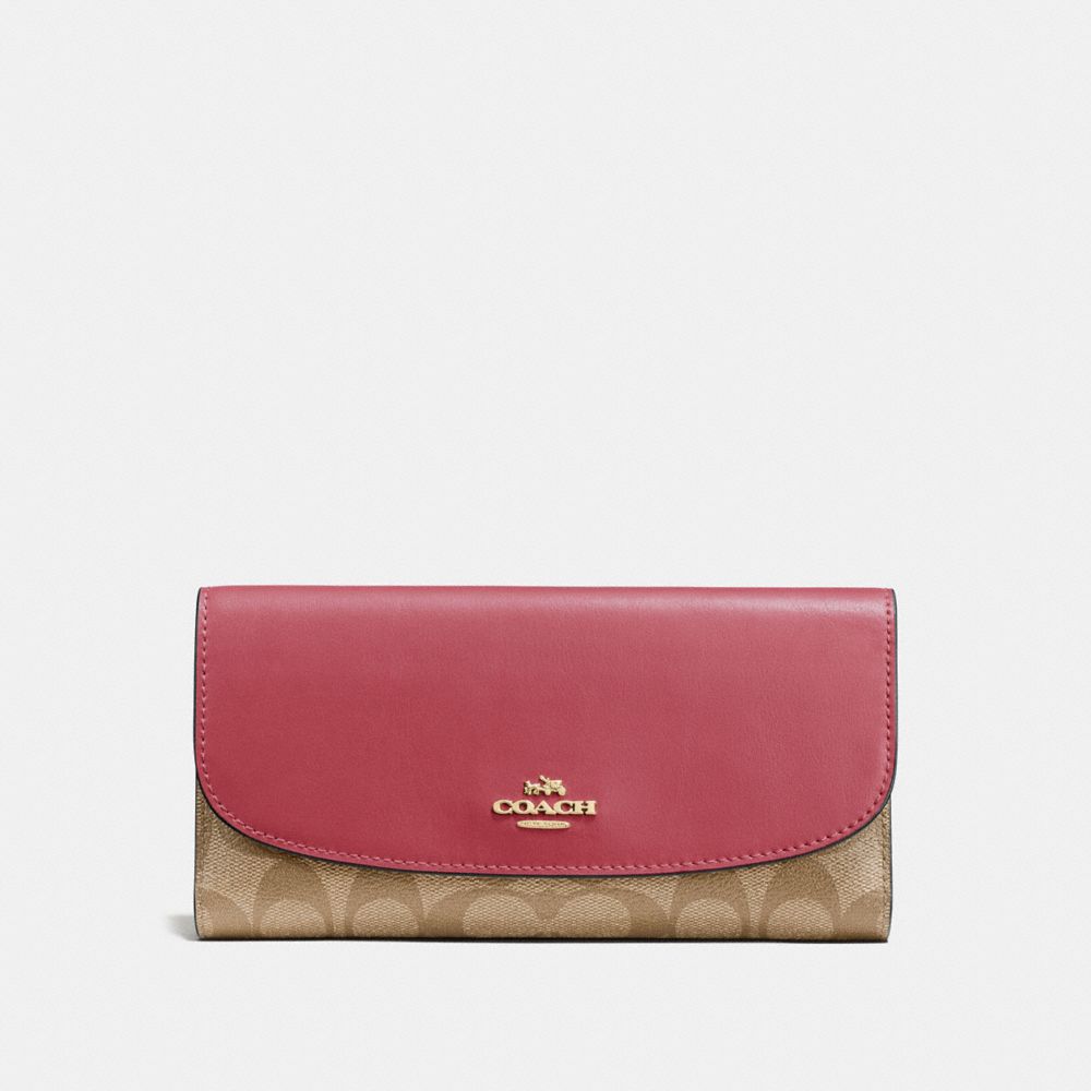 Signature coated canvas| 12 credit card slots| Full-length bill compartment| Removable checkbook holder| Snap closure| Outside zip coin pocket| 7 3/4" (L) x 4" (H)